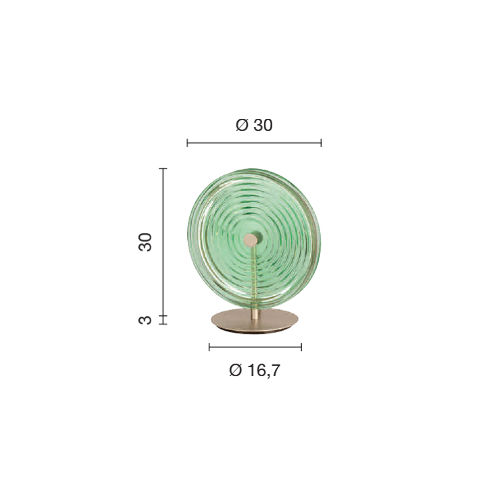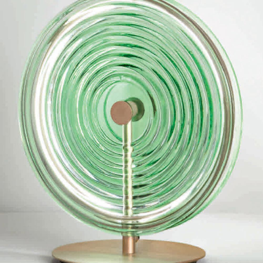 goudkleurig geverfd metaal, glas versierd met groene concentrische lijnen met