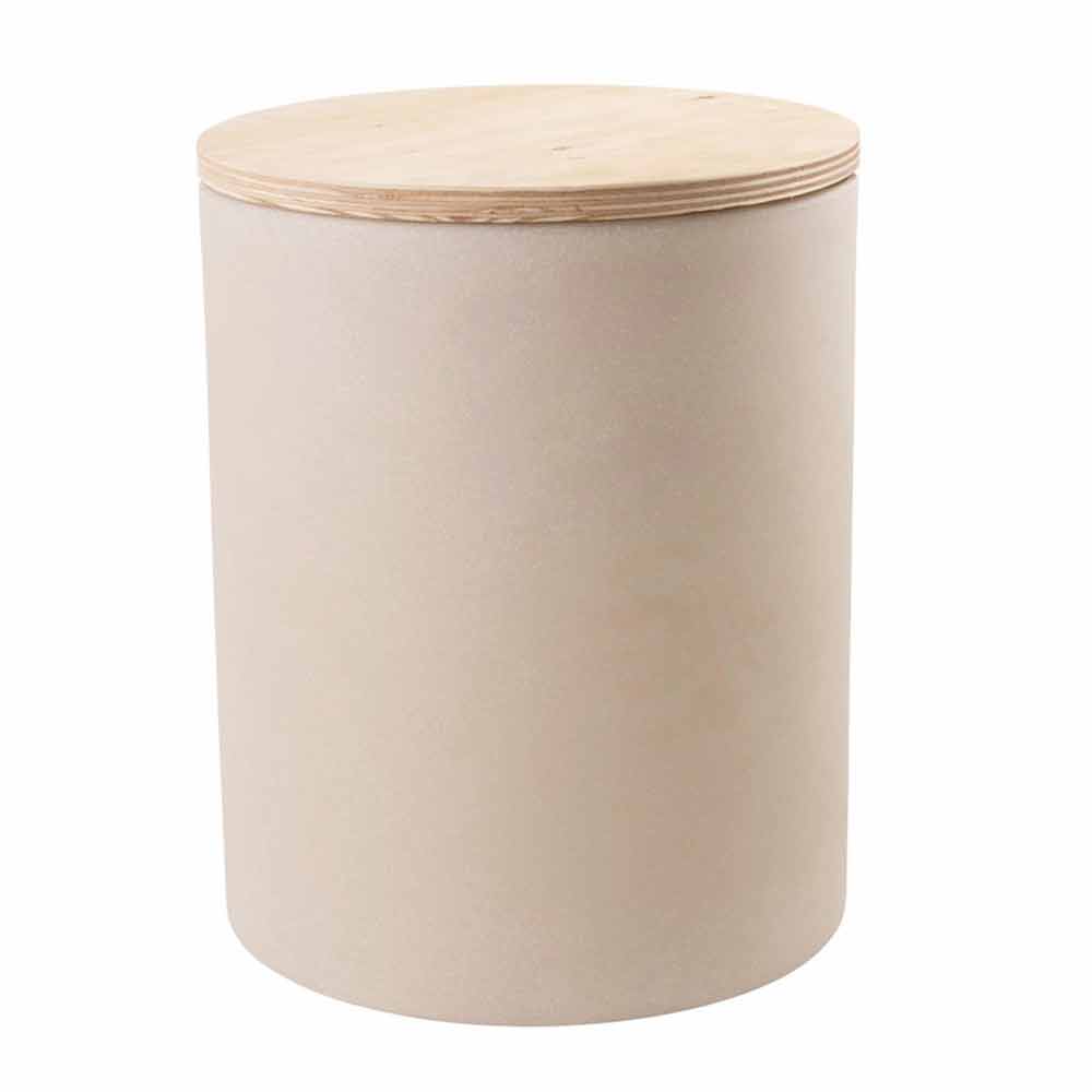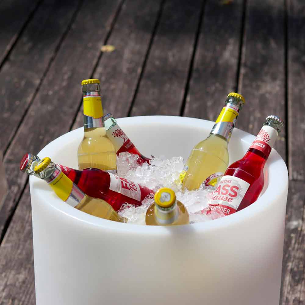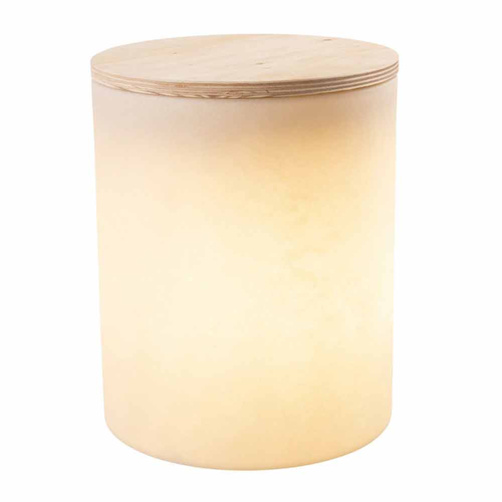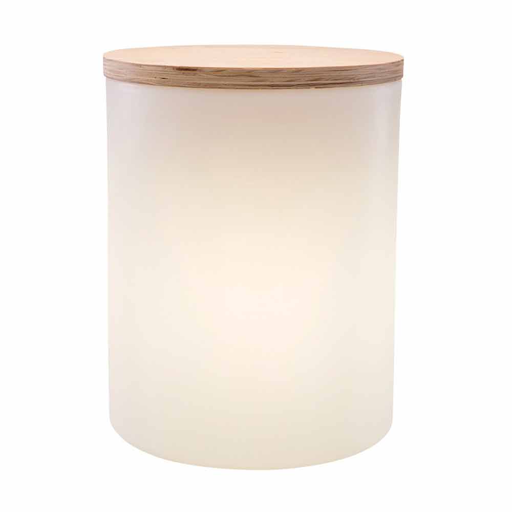 cilindrische vorm met het houten blad maakt hem geschikt om als zitplaats te gebruiken, terwijl het intelligente afvoersysteem hem ook geschikt maakt als lichtgevende pot voor planten.