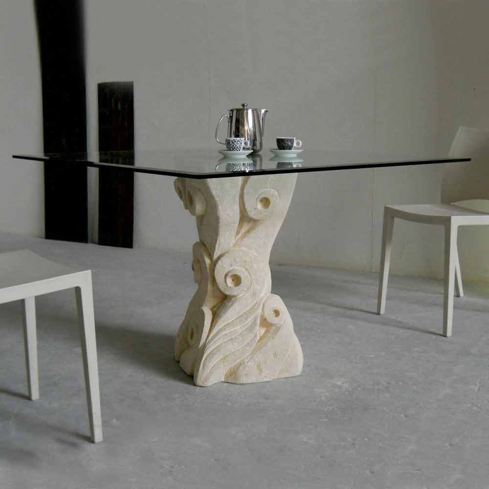 Tabel gemaakt volledig modern vierkante dineren in Italië, met een centrale basis in Vicenza natuursteen, handmatig gebeeldhouwde uit het massieve blok met floatglas boven 15 mm, met een verwijderbare stalen flens aan de basis bevestigd.