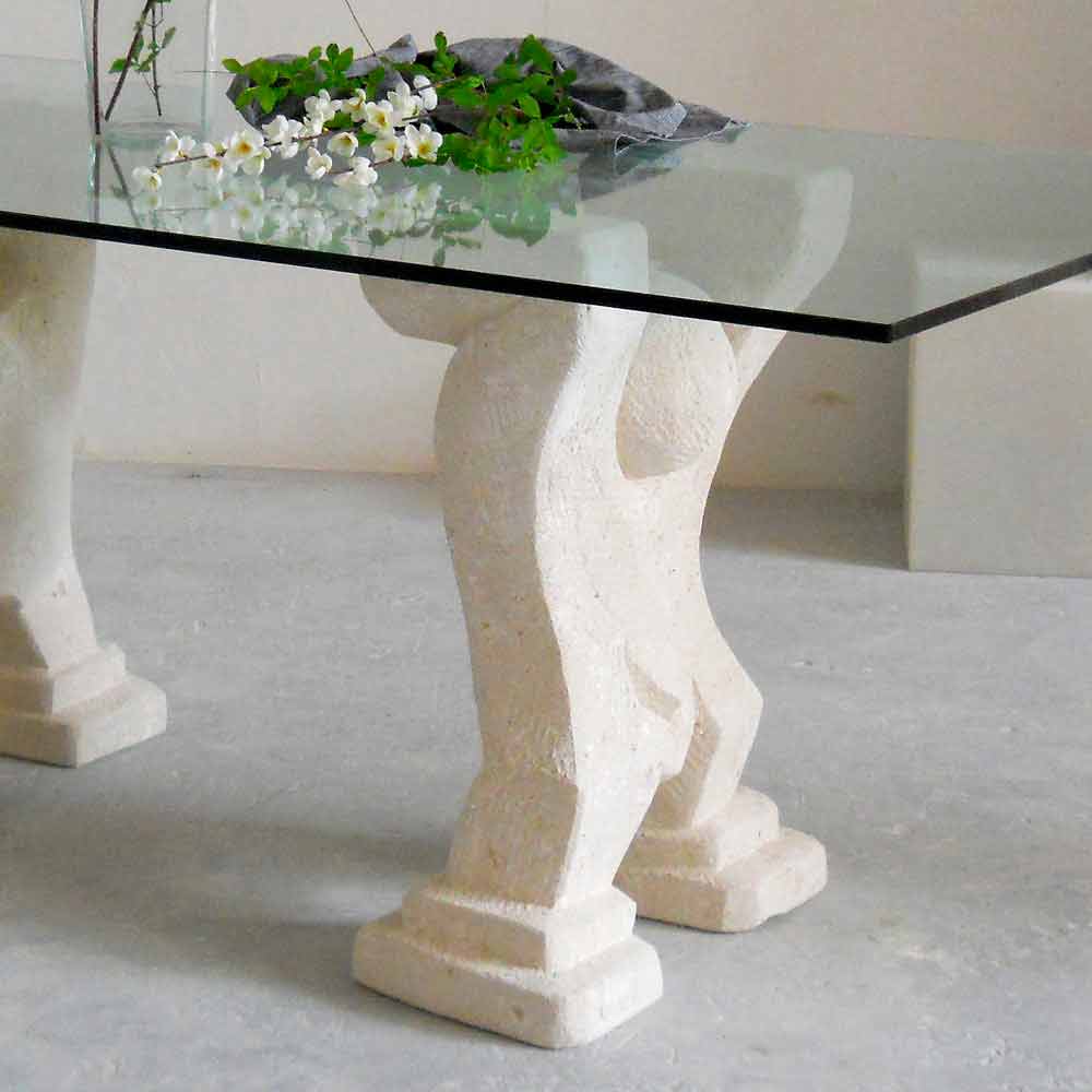 Rechthoekige eettafel moderne Made in Italy met dubbele bodem in natuursteen van Vicenza, met de hand gemaakt uit massief blok en met floatglas top dikte van 15 mm, die op de bases.