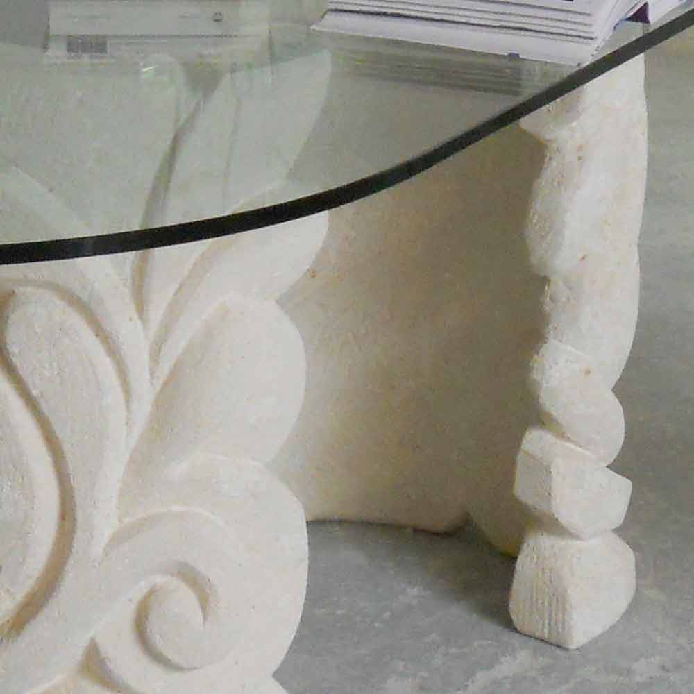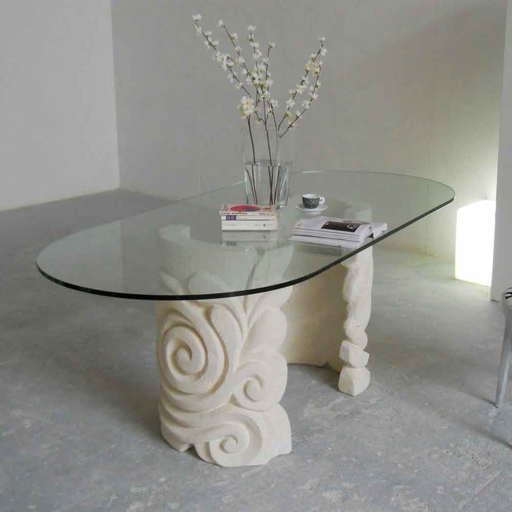 Ovale eettafel in moderne stijl Made in Italy met dubbele bodem in natuursteen van Vicenza, met de hand gemaakt uit massief blok en met floatglas top dikte van 15 mm, die op de bases.