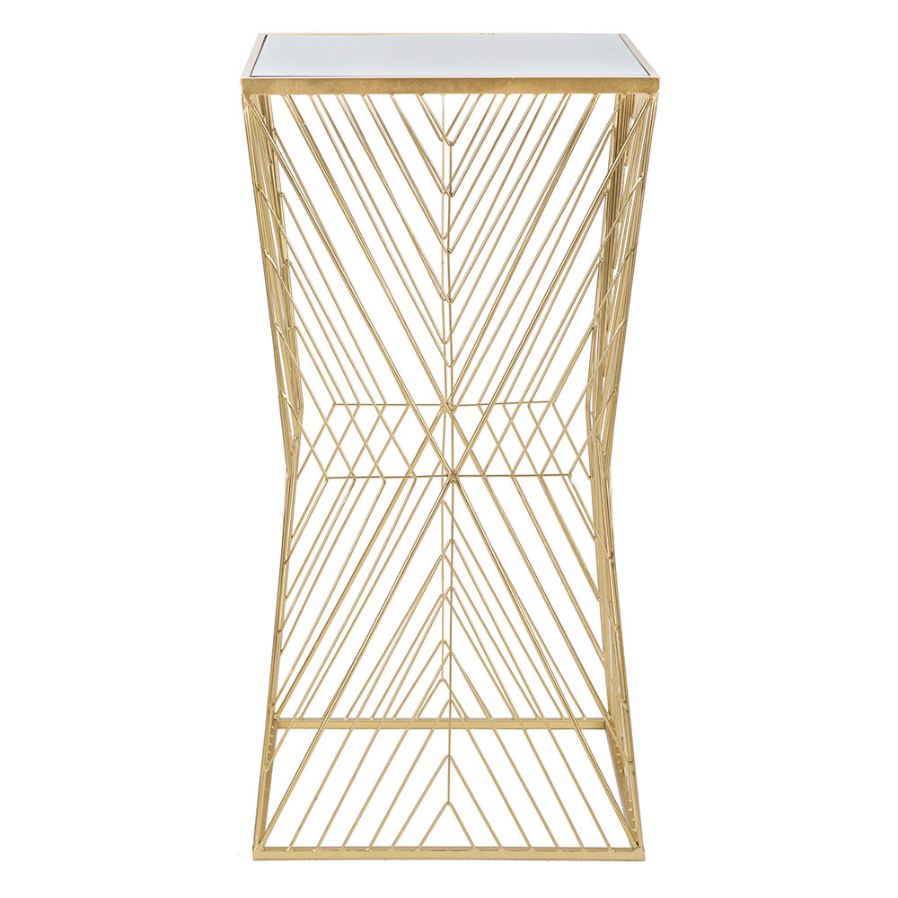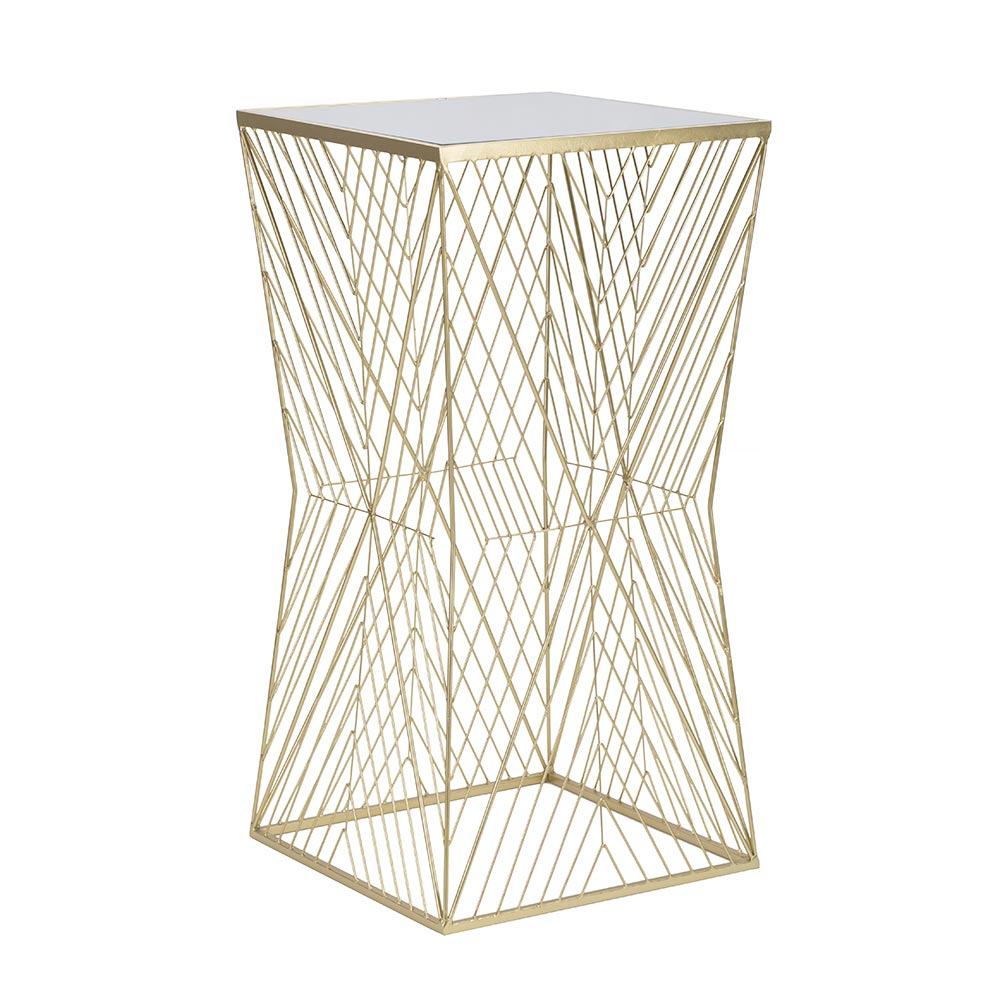 Het glazen blad, gevat in een gouden frame, is praktisch en gemakkelijk schoon te maken en biedt een ideaal oppervlak voor uw favoriete decoratieve objecten, van een designlamp tot een weelderige plant. De structuur biedt een vleugje sprankeling die elke kamer, van de woonkamer tot de slaapkamer, kan opfleuren, zonder te ver te gaan in weelde.