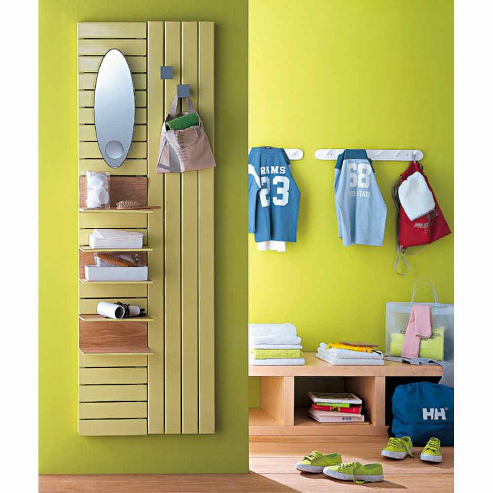 Hydraulische radiator, praktisch en functioneel met een lineair ontwerp, verwarmt en organiseert elke omgeving waarin hij wordt geplaatst. Verticale radiator in gekleurd staal, compleet met planken (zoals afgebeeld op de foto) met rugleuningplanken en blad in natuurlijk eikenhout.