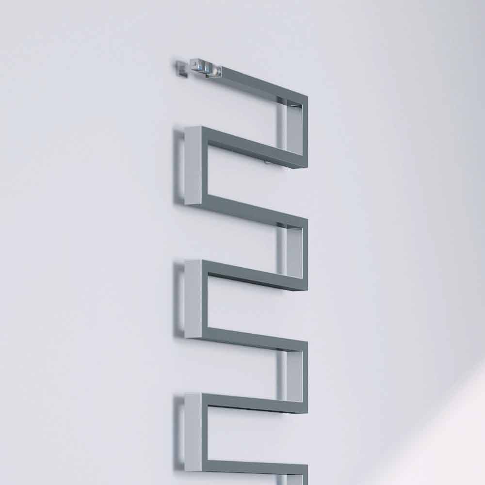 Verticale radiator in chroomstaal, in hydraulische versie. Een collectie met een sterk grafisch uithangbord. Vorm, materiaal, functie en technologie zorgen niet langer voor eenvoudige handdoekverwarmers, maar voor echte inrichtingselementen.