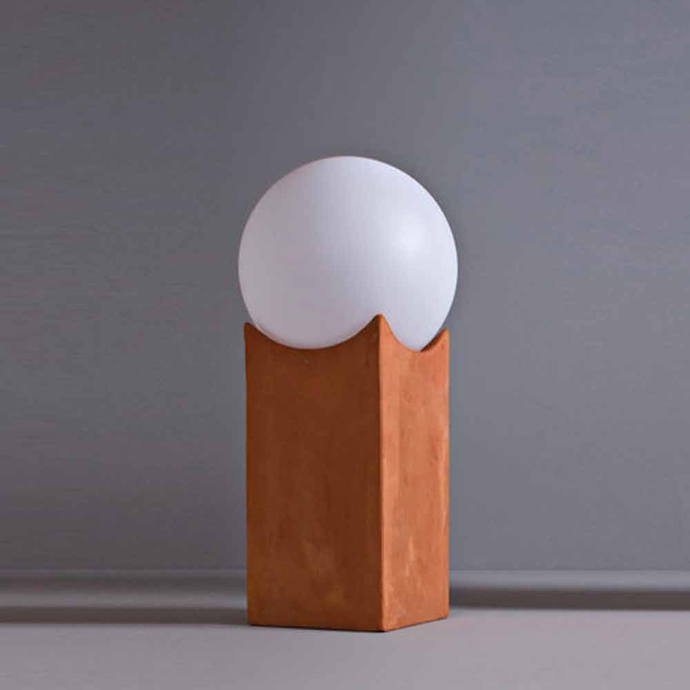De ATLAS -serie stelt een herinterpretatie van de buitenlantaarn voor, gespeeld op het contrast tussen de rondheid van de lichtgevende bol en de hoekigheid van de terracotta basis.