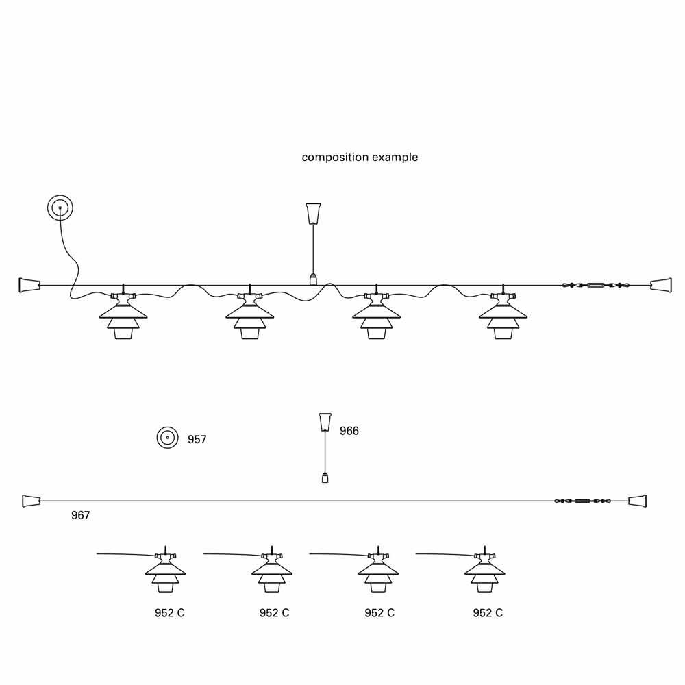 Aan te sluiten op plafondkap artikel 970 . Dankzij de plafondkap is het mogelijk om interessante lichtcomposities te creëren door deze lamp te combineren met de andere hanglampen uit de collectie: 951, 954-22 en 952.