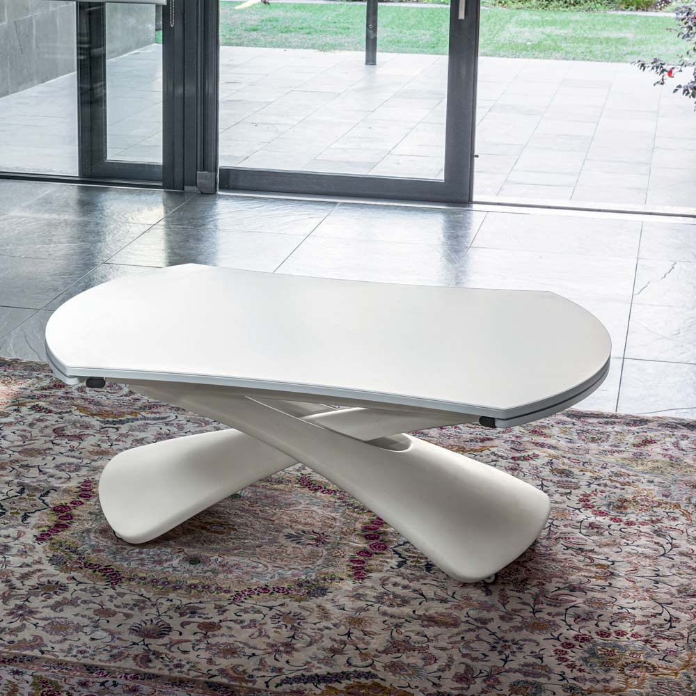 salontafel verandert in een eettafel door middel van een gasmechanisme,