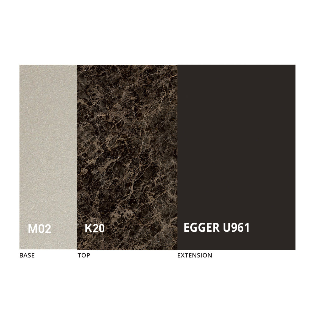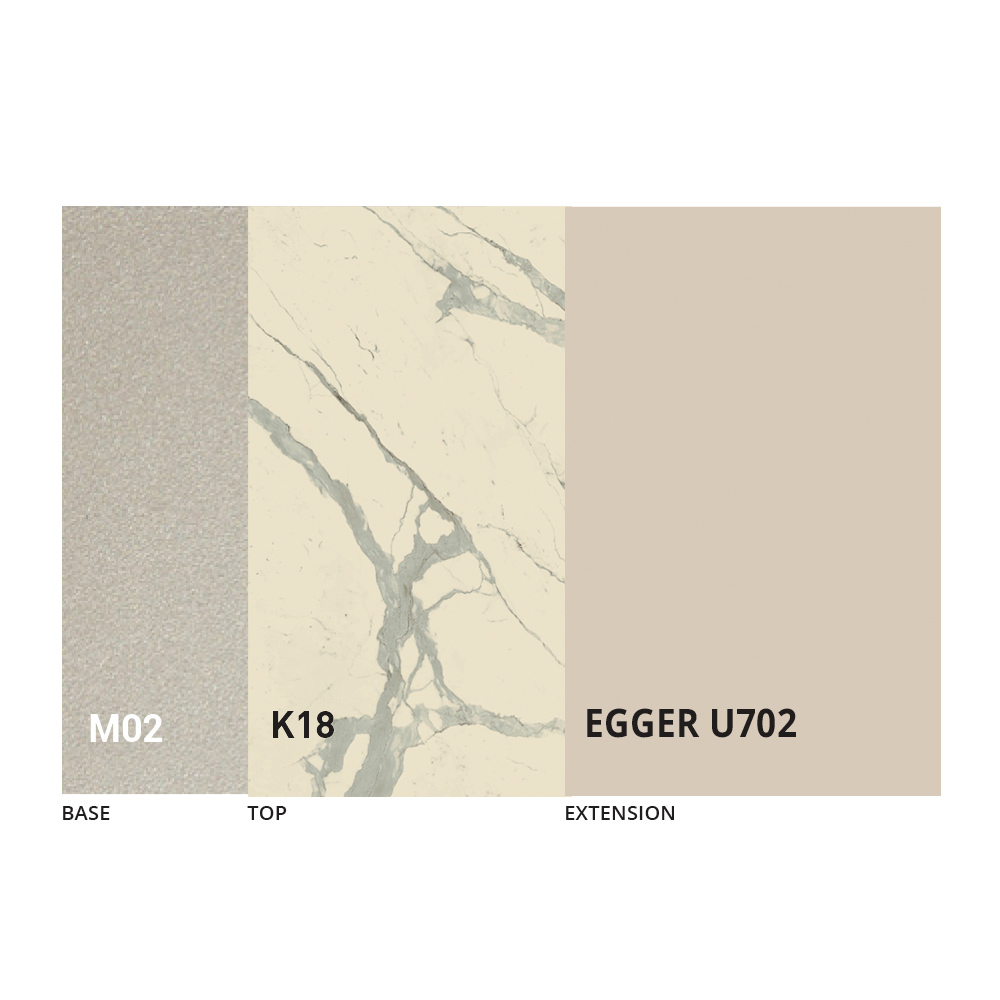 Het blad is verkrijgbaar in melamine, mat keramiek, glas en morteleffect in een breed scala aan afwerkingen.