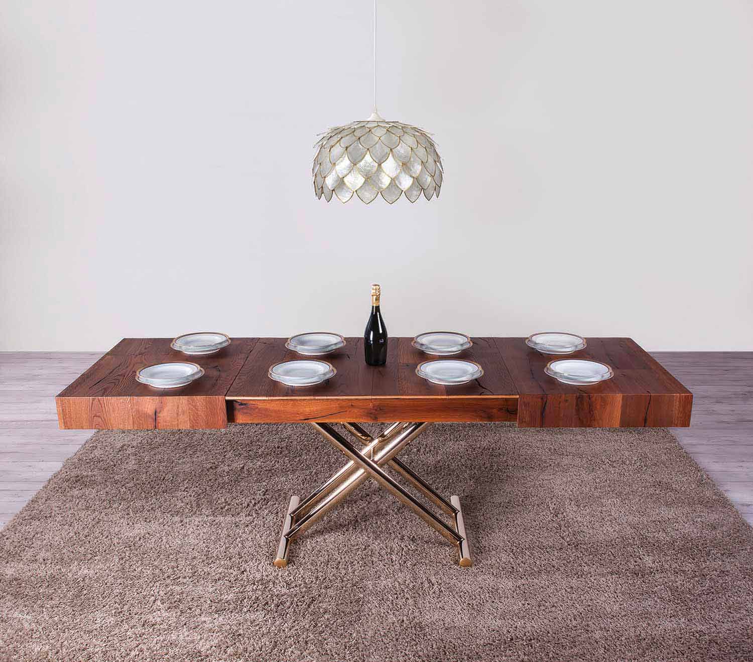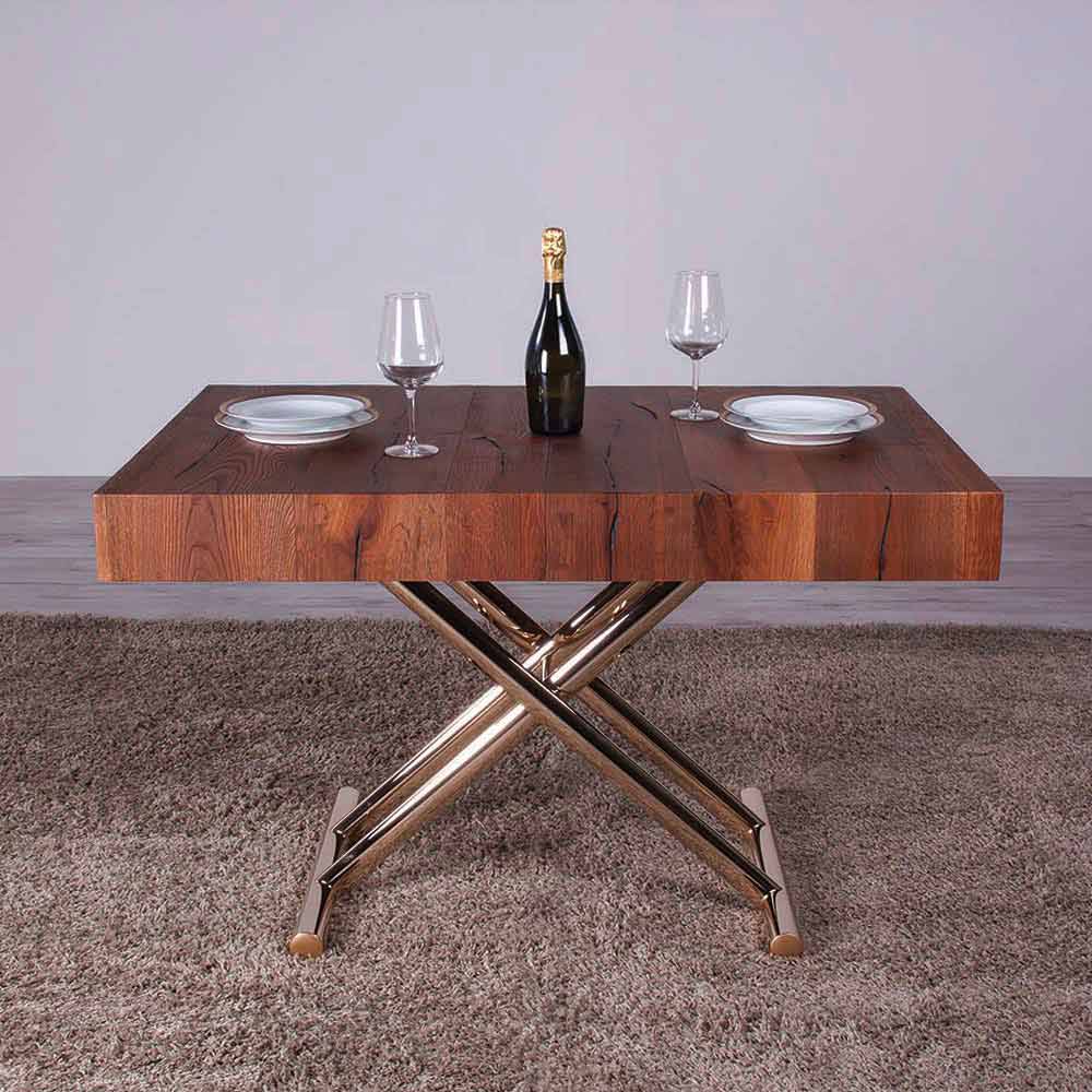 Moderne salontafel omvormbaar tot eettafel met houten blad en metalen onderstel Made in Italy.