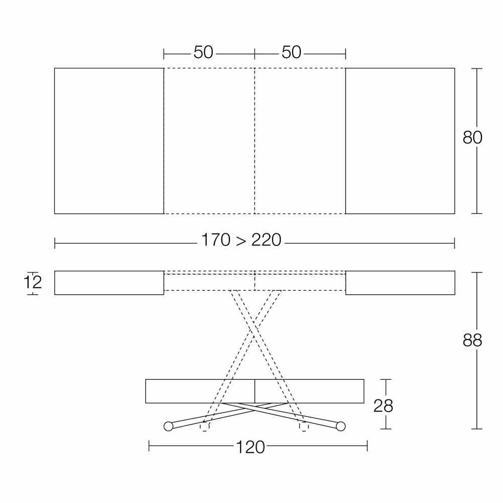 Het blad is rechthoekig en uitschuifbaar door middel van 2 interne verlengstukken van elk 50 cm.
