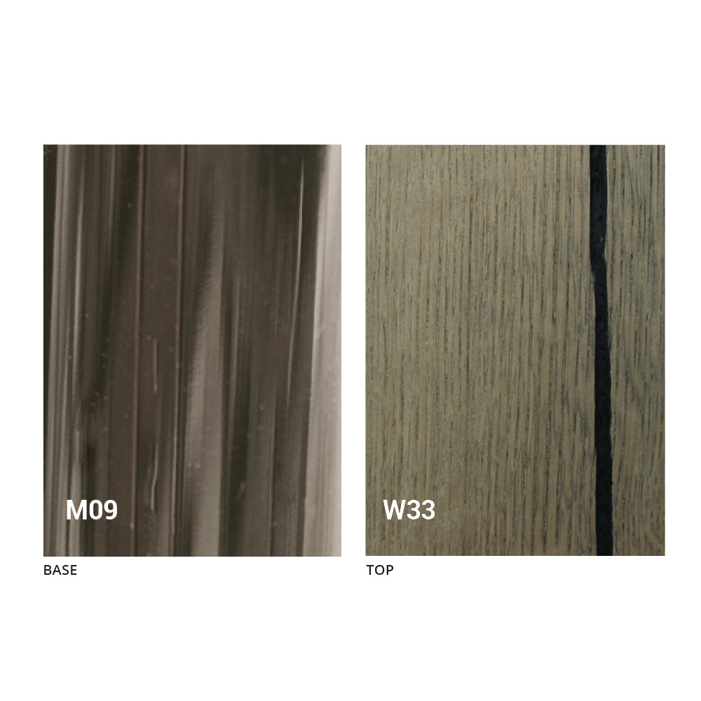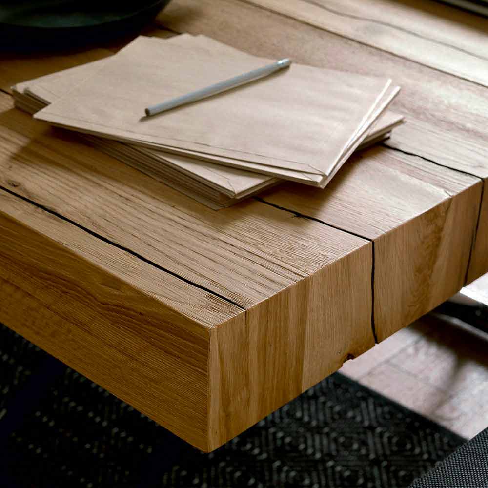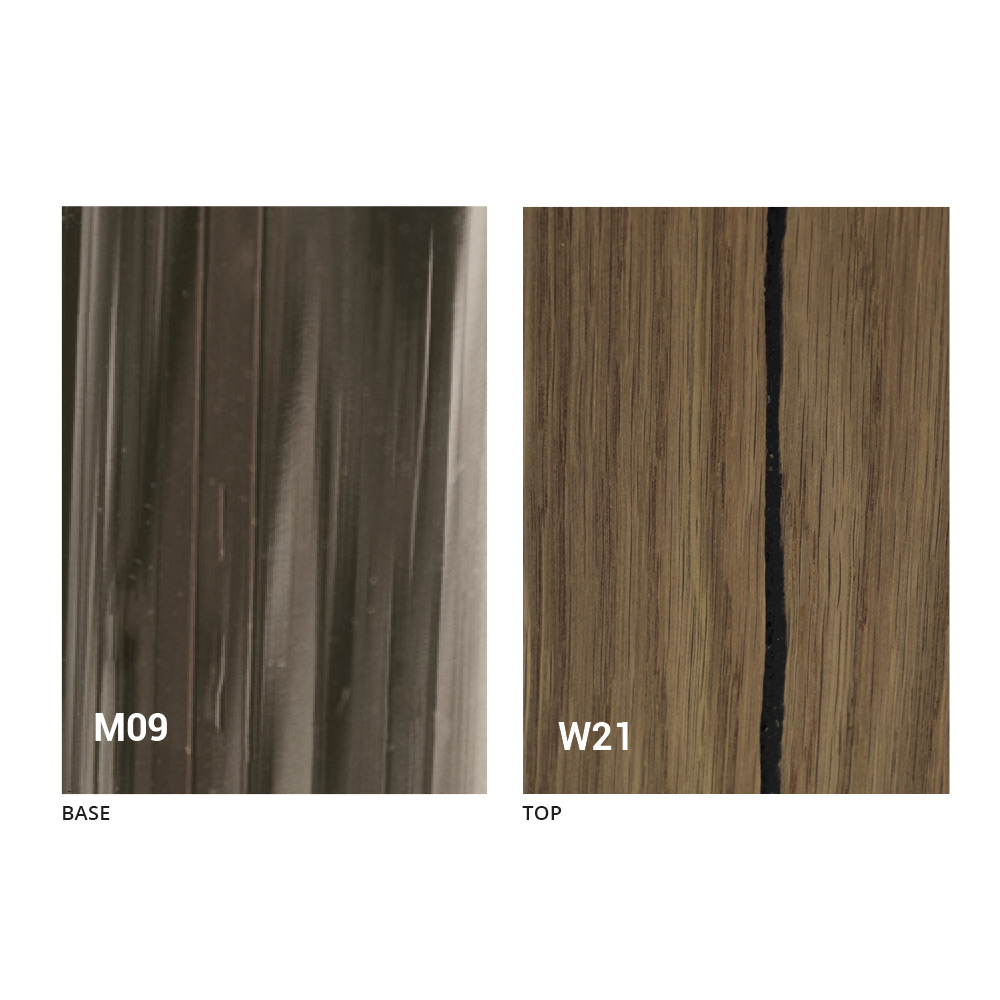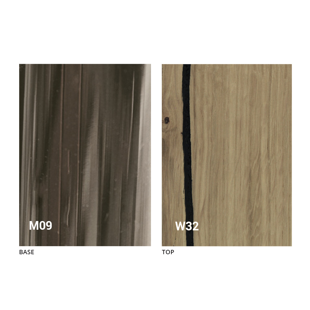 Het massief houten blad is verkrijgbaar in de volgende afwerkingen:- thermisch behandeld massief oud eiken;