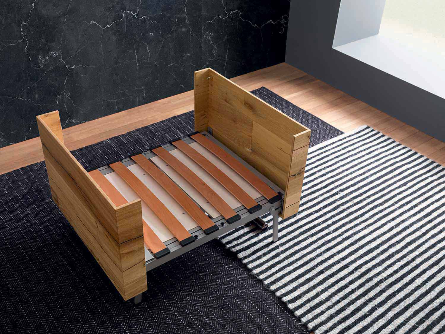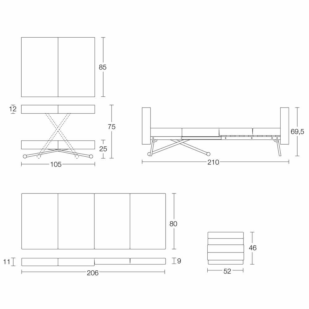 Uitgerust met een poef die kan worden omgevormd tot een matras (D 35 brandwerend polyurethaanschuim), bekleed met grijze stof. Lattenbodem en multiplex paneel. Inklapbare steunpoten. Tavoletto