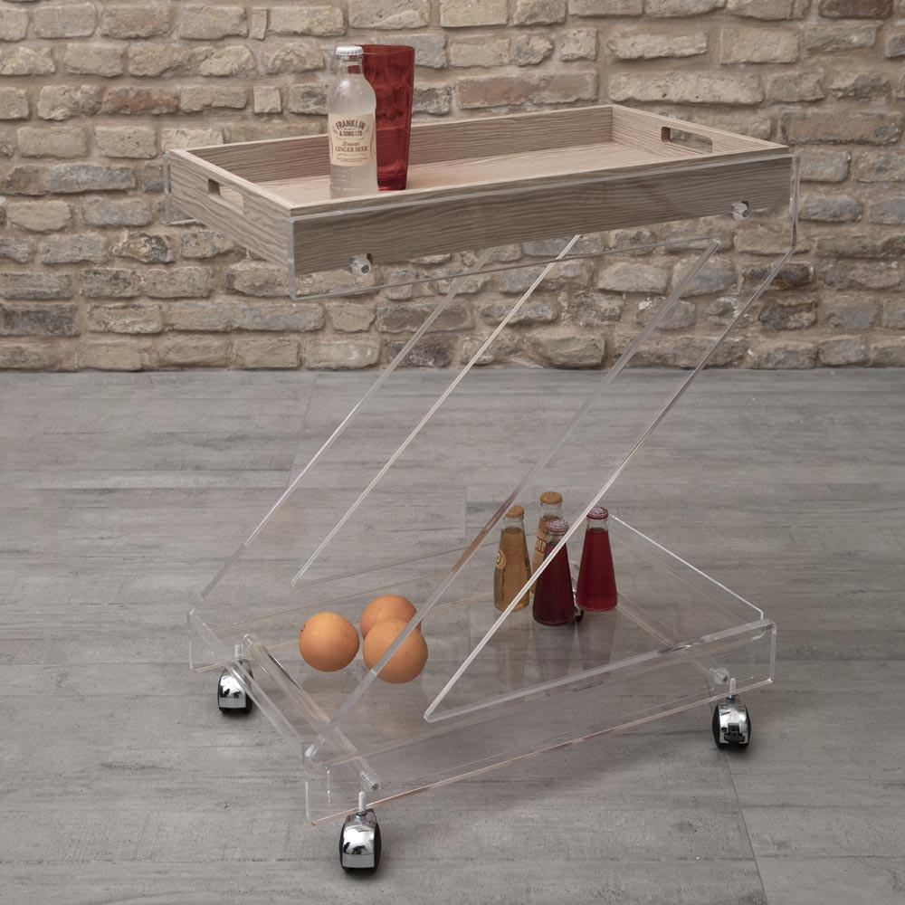 Transparante acrylkristal trolley met wielen en 2-afwerking tray, made in Italy.