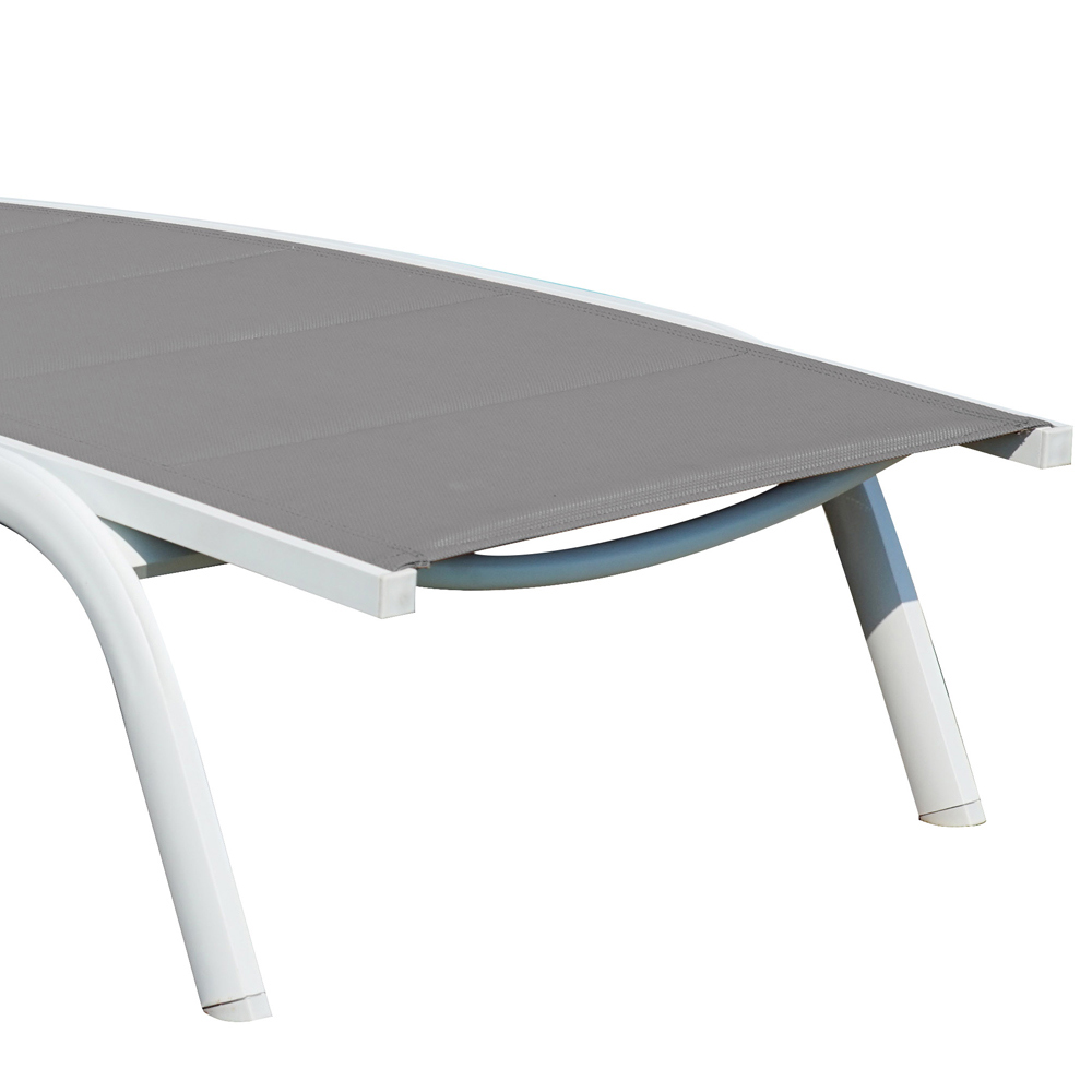 Stapelbare chaise longue voor buiten met textileen zitting en aluminium structuur.