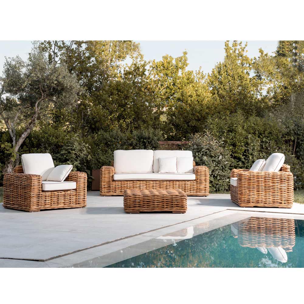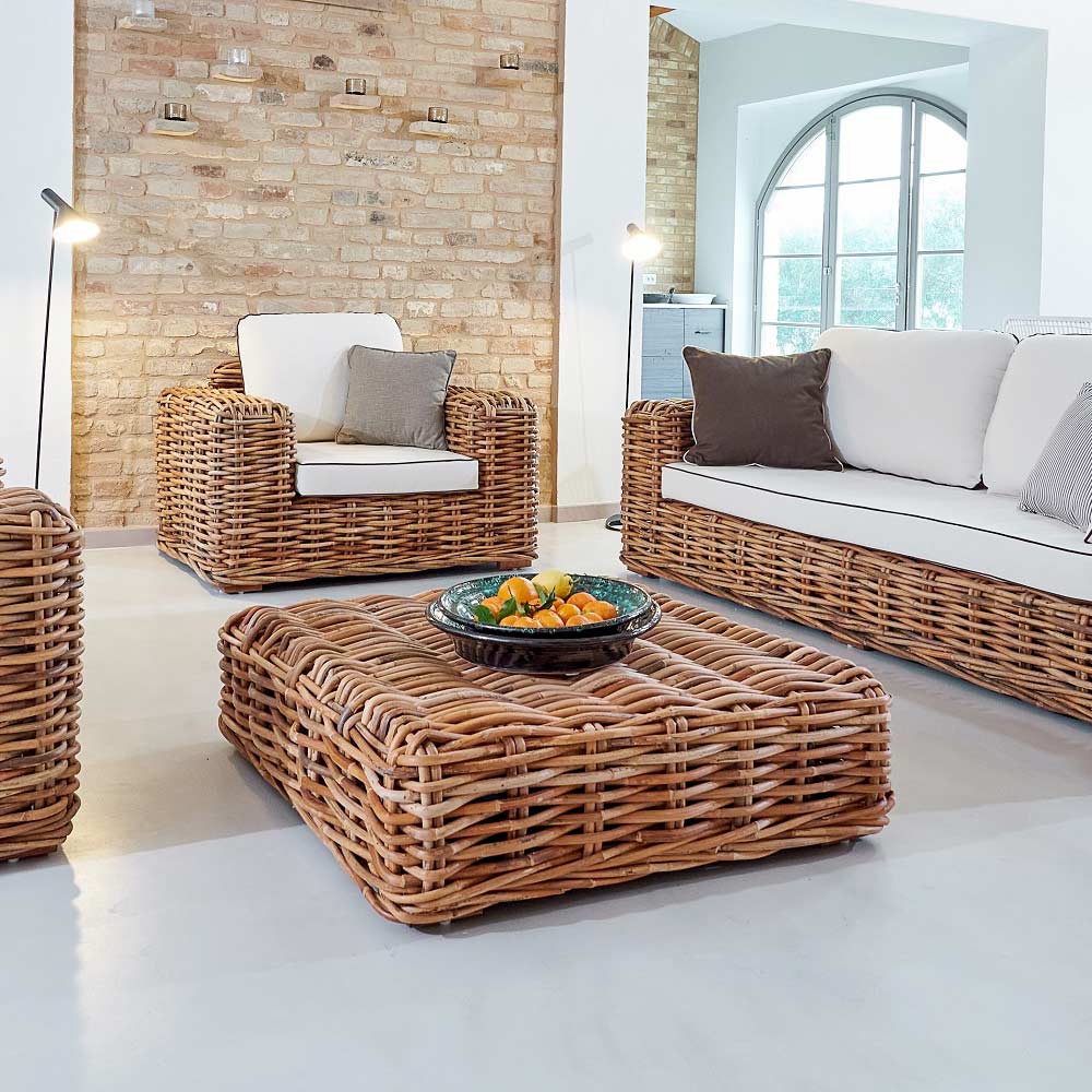 Outdoor salontafel-poef in natuurlijk rotan met kussen.