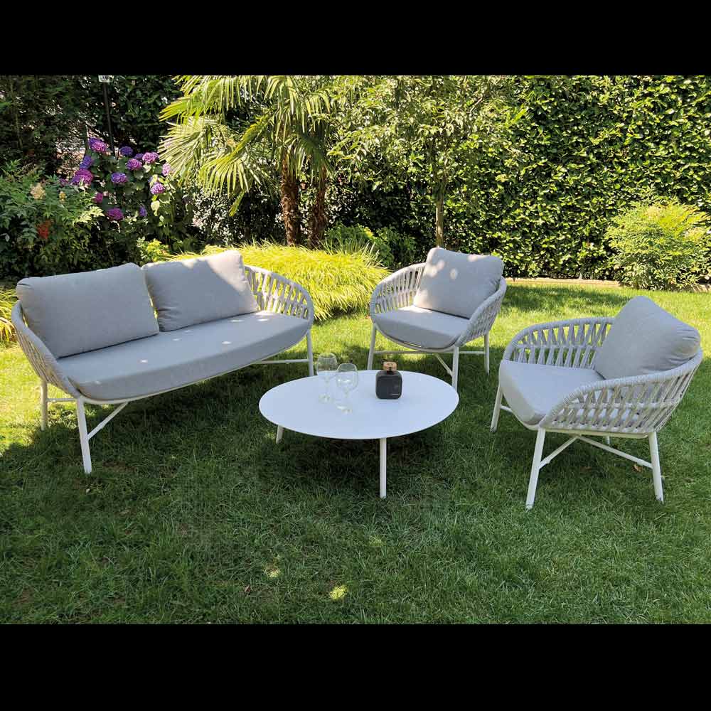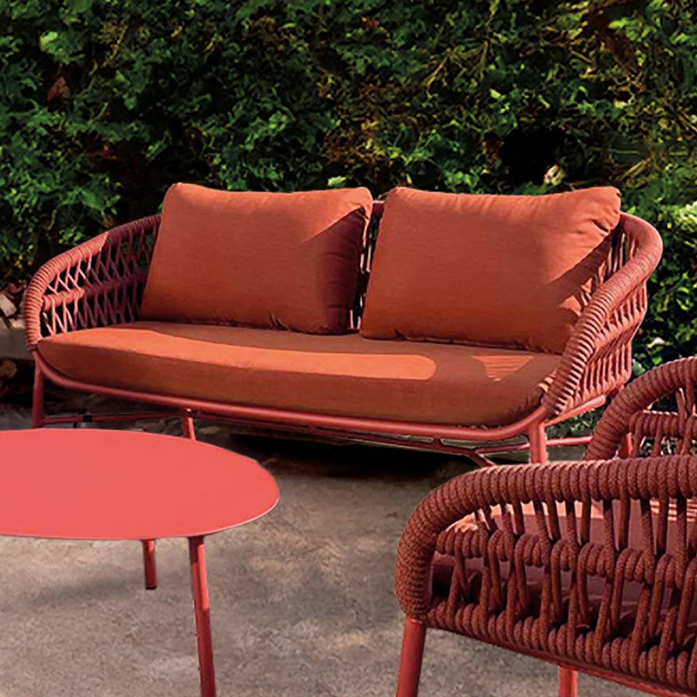 Deze tuinbank is een perfect voorbeeld van gastvrij design en ambachtelijke verfijning , ideaal voor het creëren van een loungehoek gewijd aan ontspanning en stijl . De gelakte aluminium structuur, licht maar duurzaam, ondersteunt elegant een verfijnde vlecht van polyester touw , wat de zitting beweging en persoonlijkheid geeft.