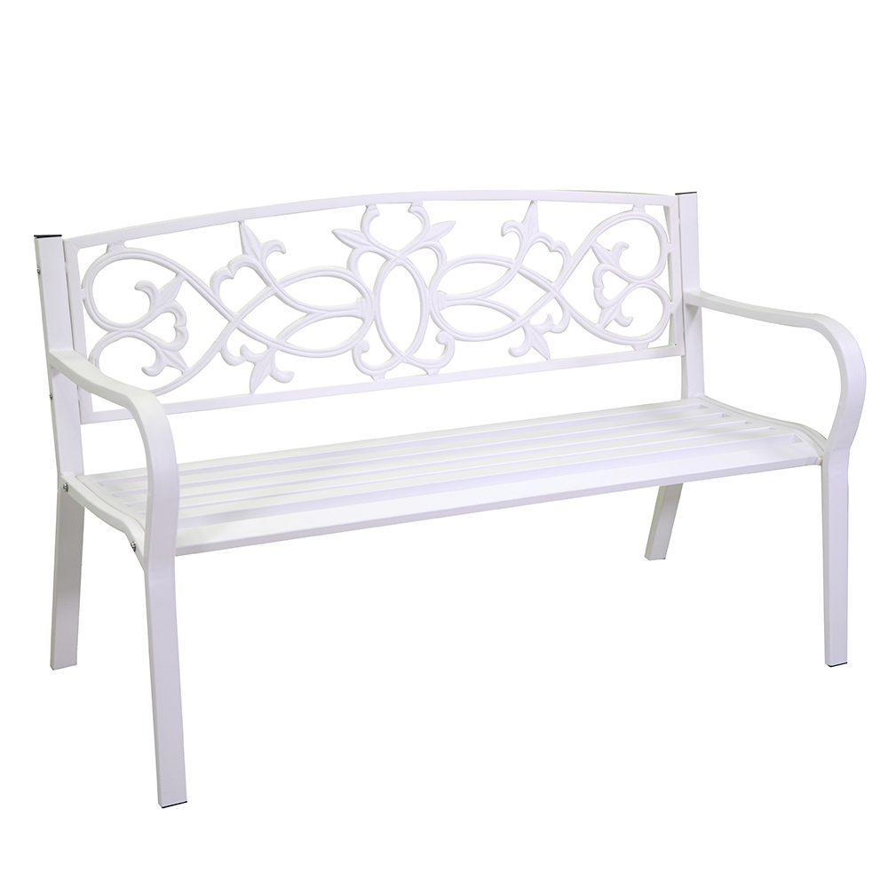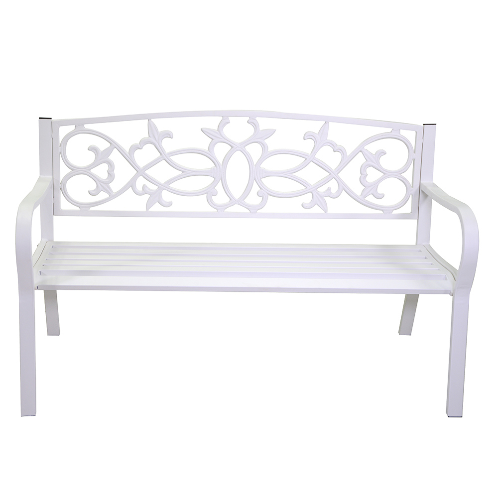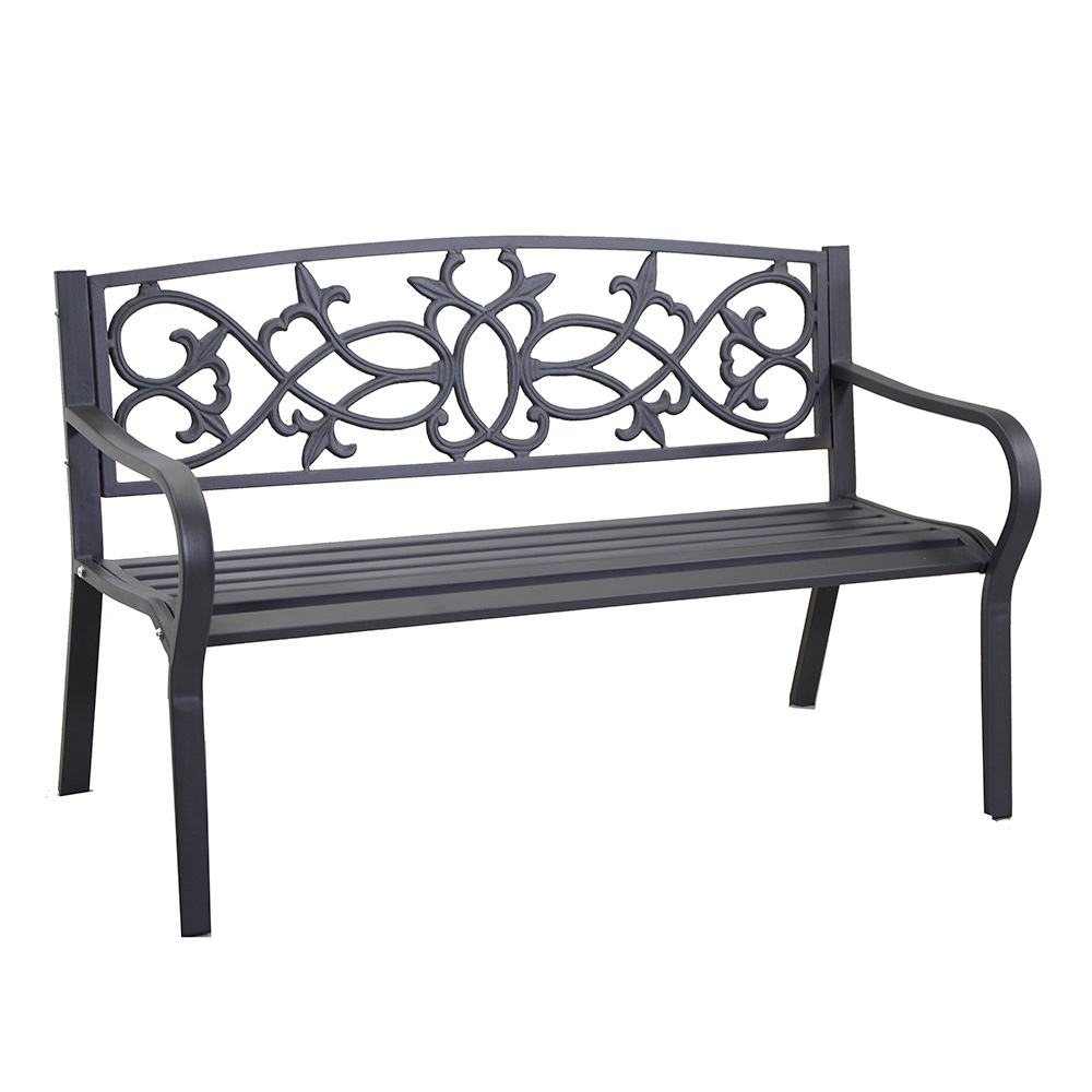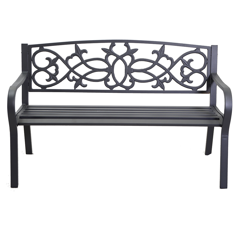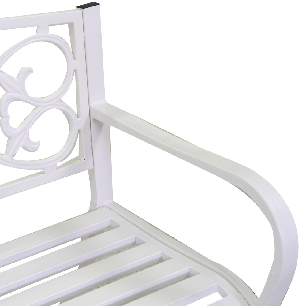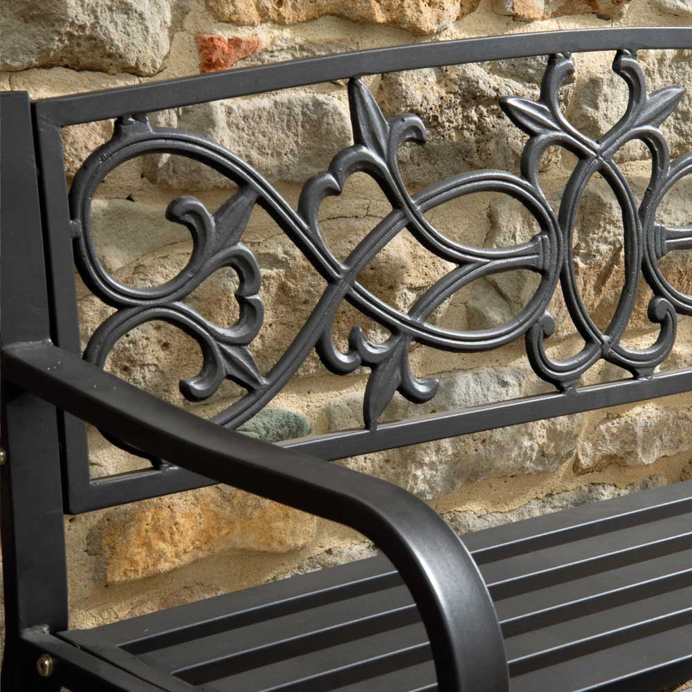 Het ornamentele detail op de rug combineert klassieke motieven met een vleugje moderniteit, waardoor een visueel aantrekkelijk middelpunt ontstaat. Gemaakt van duurzaam metaal , is deze bank ontworpen om lang mee te gaan, bestand tegen de elementen en het behoud van haar esthetische schoonheid zonder dat er overmatig onderhoud nodig is.