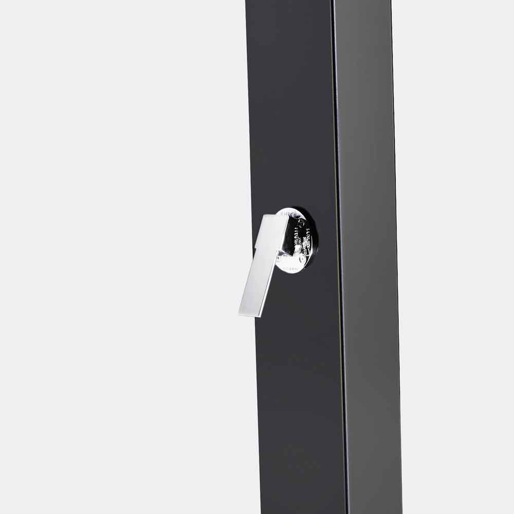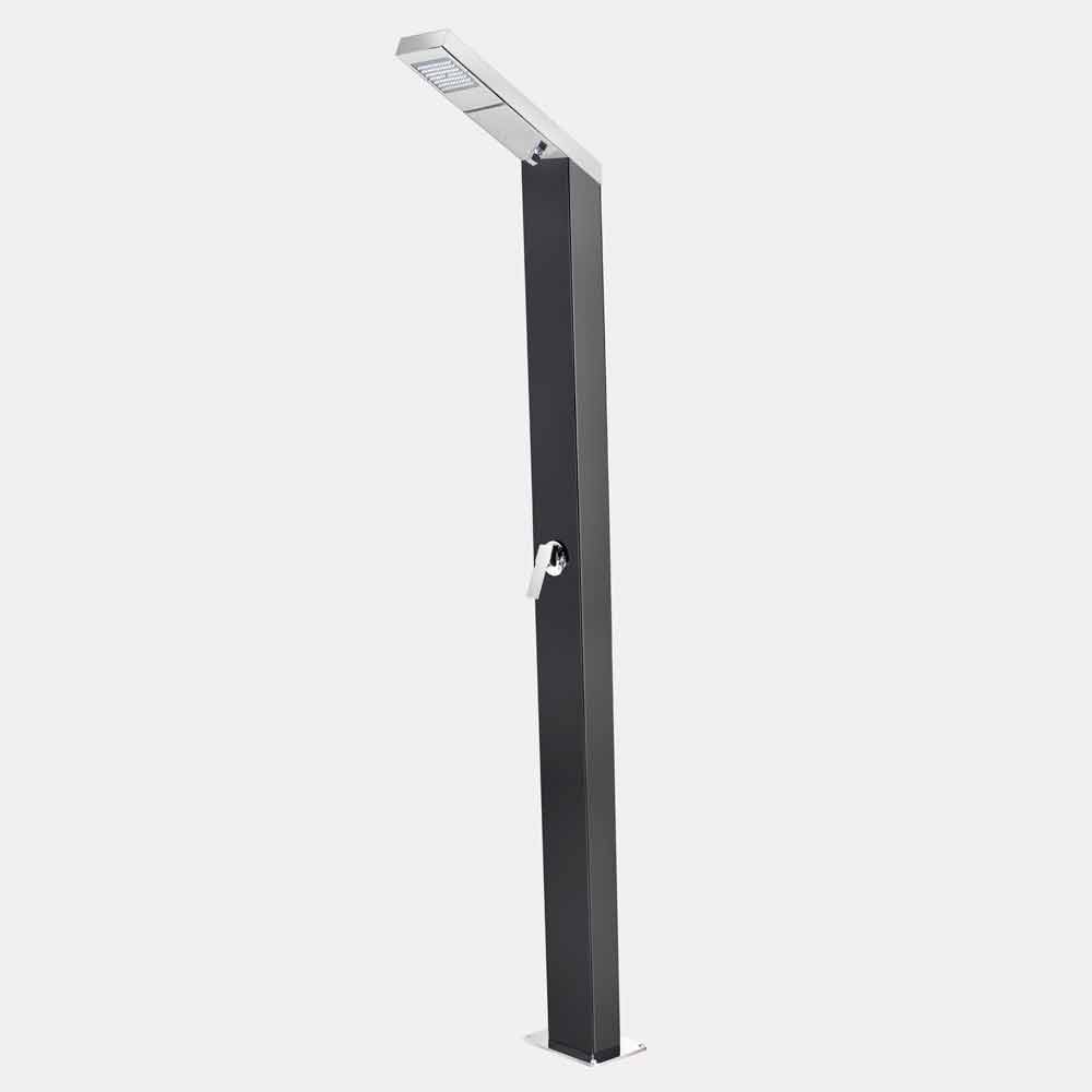 Zwart gelakte stalen tuindouche op zonne-energie met watervalstraal, gemaakt in Italië.