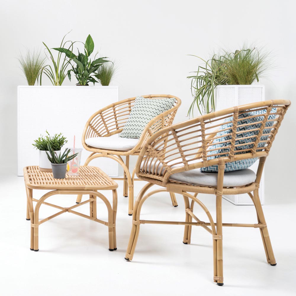 Polyrattan vezels zijn van de hoogste kwaliteit die op de markt verkrijgbaar is (VIRO/REHAU). Ze zijn gemaakt van speciaal polyethyleen met een hoge dichtheid (HDPE) en zijn gecertificeerd om atmosferische invloeden en zelfs extreme klimaatfactoren te weerstaan, zonder significante structurele schade op te lopen en met behoud van kleurvastheid. Waar nodig raden we aan microvezeldoekjes, neutrale schoonmaakmiddelen en warm water te gebruiken om deze vezels te reinigen.