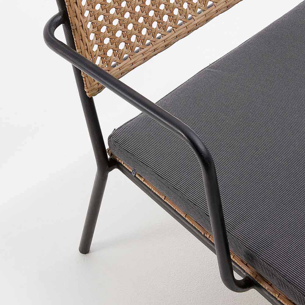 Tuinfauteuil met een zwart gepoedercoat gegalvaniseerd stalen frame; zitting en rugleuning van beige geweven polypropyleen.