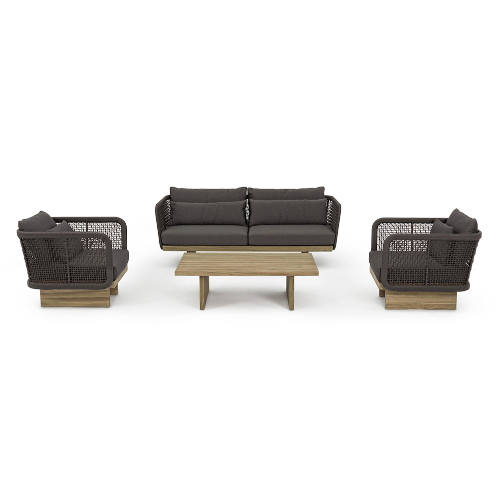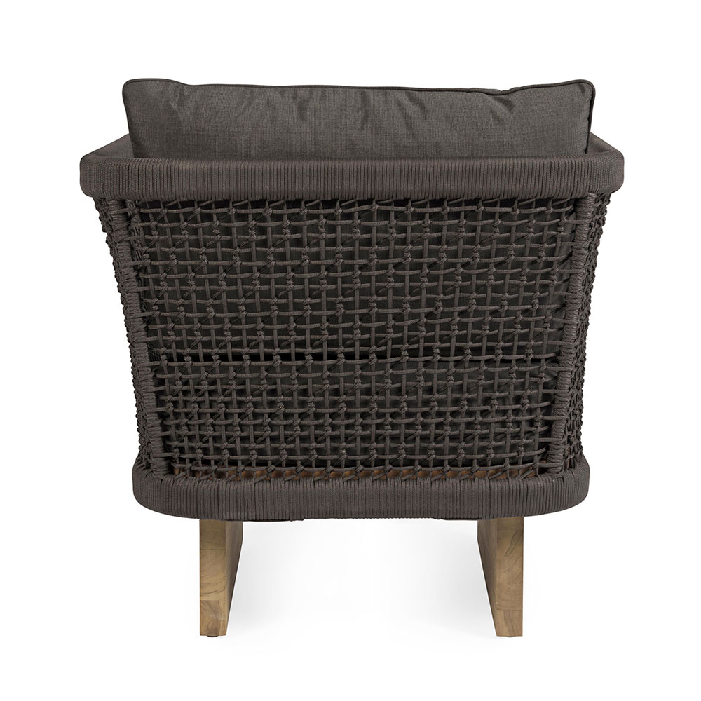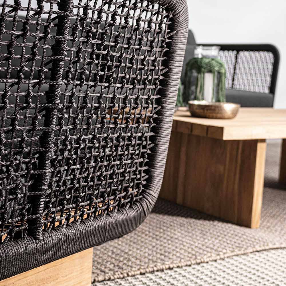 Aluminium structuur met poedercoating (polyester). Zitting en poten in teak - SVLK (gecertificeerd hout uit duurzame bossen) met een rustieke afwerking. Geweven voor buitengebruik in touw (polypropyleen), waterafstotend en UV-bestendig. Afneembare kussens met sunbrella-stof (100% acryl), waterafstotend en UV-bestendig. Sneldrogende schuimvulling voor buitengebruik (anti-vochtigheid).