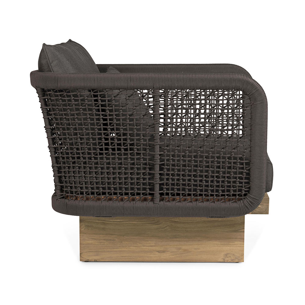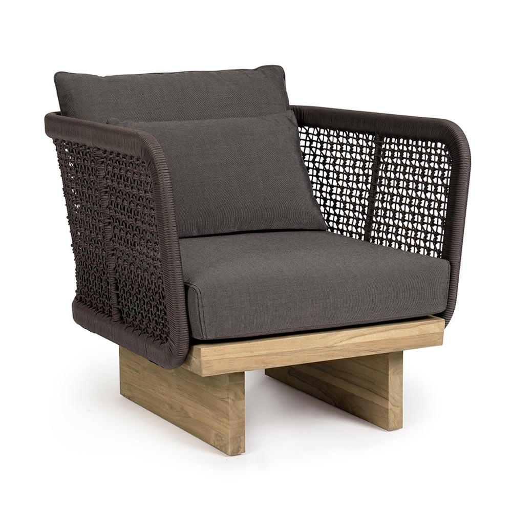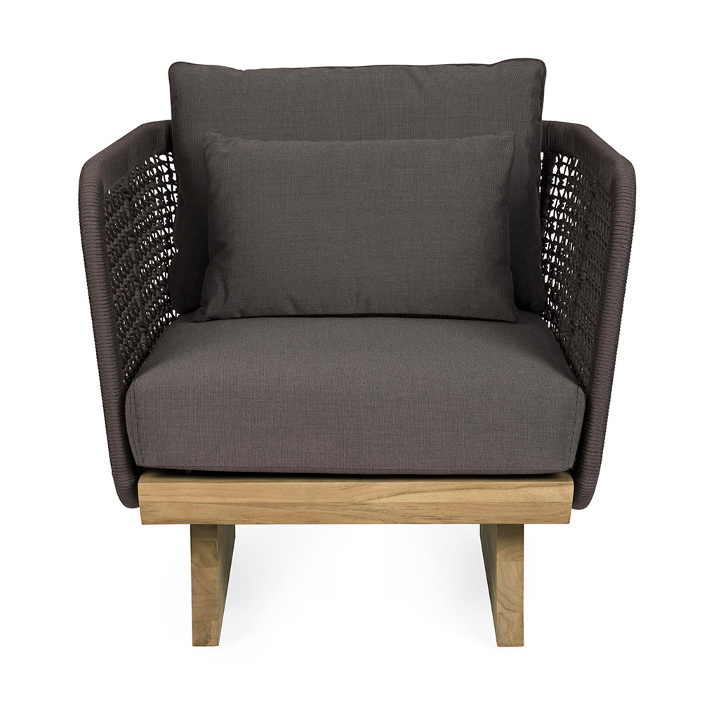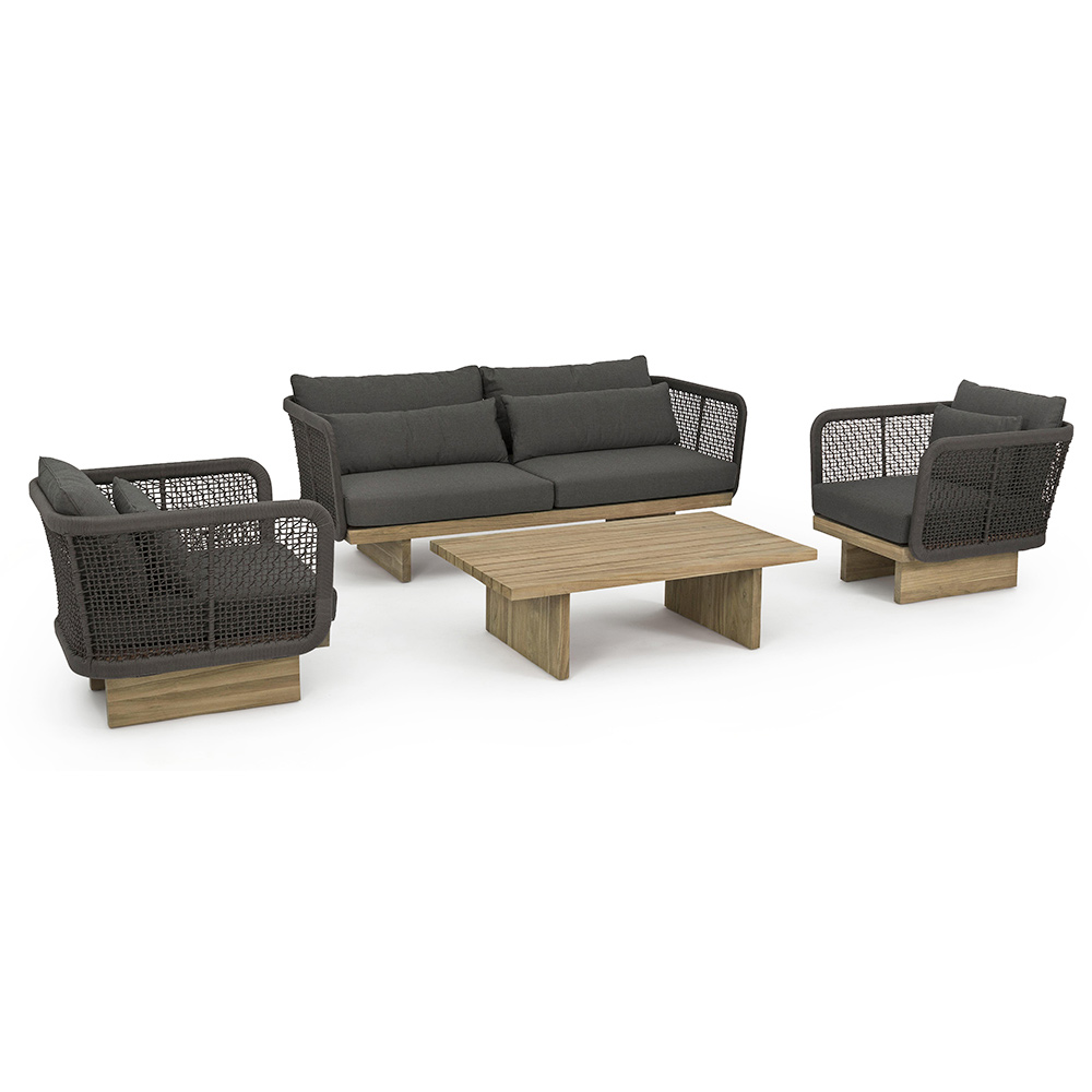 Aluminium structuur met poedercoating (polyester). Zitting en poten in teak - SVLK (gecertificeerd hout uit duurzame bossen) met een rustieke afwerking. Geweven voor buitengebruik in touw (polypropyleen), waterafstotend en UV-bestendig. Afneembare kussens met sunbrella-stof (100% acryl), waterafstotend en UV-bestendig. Sneldrogende schuimvulling voor buitengebruik (anti-vochtigheid).