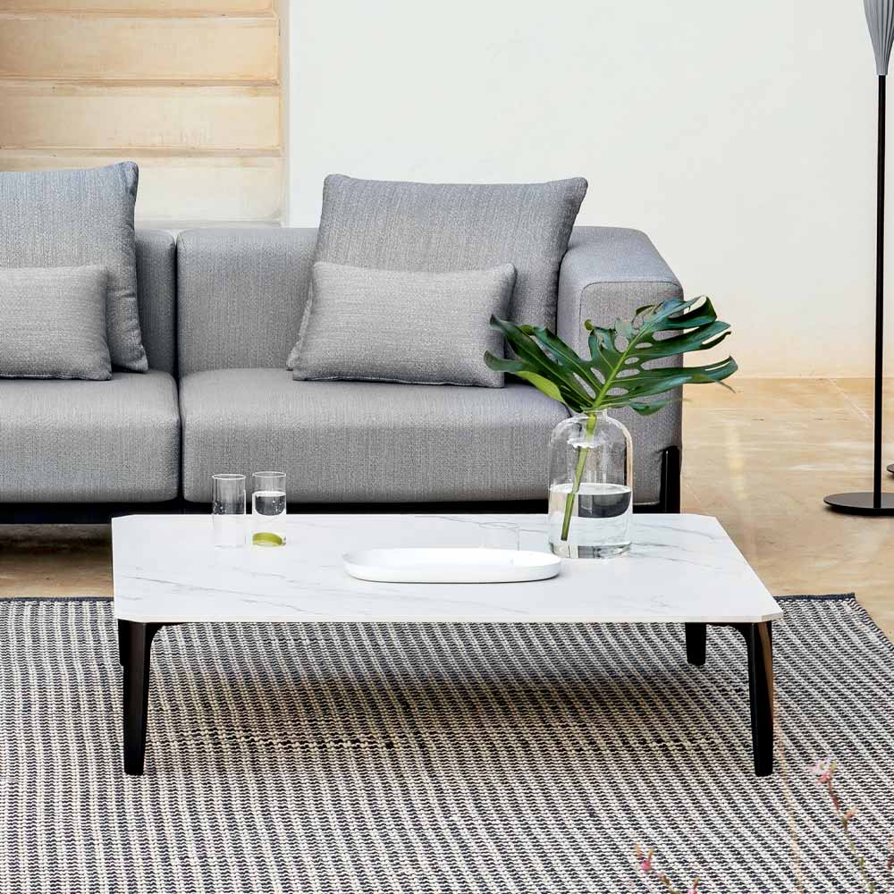 De collectie kenmerkt zich door het detail van de aluminium poot als middelpunt, om het buitenleven te ervaren in termen van maximale ontspanning en gezelligheid, zittend op de bank, rond een tafel of liggend op de zonnebank.