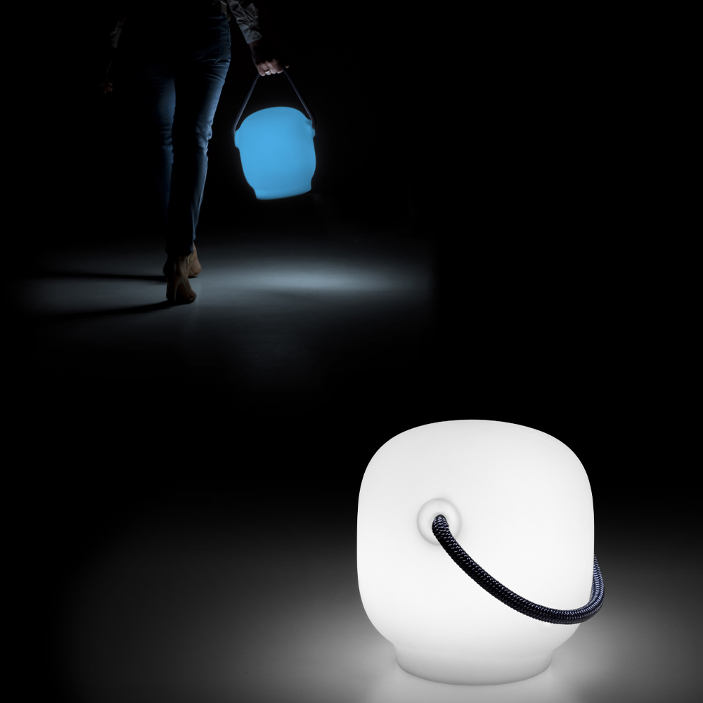 Buitenlamp volledig gemaakt in Italië in mat polyethyleen met handvat en praktische RGB LED-verlichtingsset . Een draagbare lamp met kleine afmetingen die in elke stilistische context een sfeervol licht creëert. Zijn eigenaardigheid is de stroomvoorziening via een interne batterij die het mogelijk maakt, samen met de praktische gekleurde touwhandgreep , om beweging te vergemakkelijken, waardoor een echte hervulbare lantaarn ontstaat. Het moderne en avant-gardistische ontwerp maakt het een perfecte oplossing voor zowel huiselijke buitenruimtes als voor contractomgevingen waarin gespeeld kan worden met verschillende stijlen en esthetiek voor een exclusief en verfijnd resultaat .