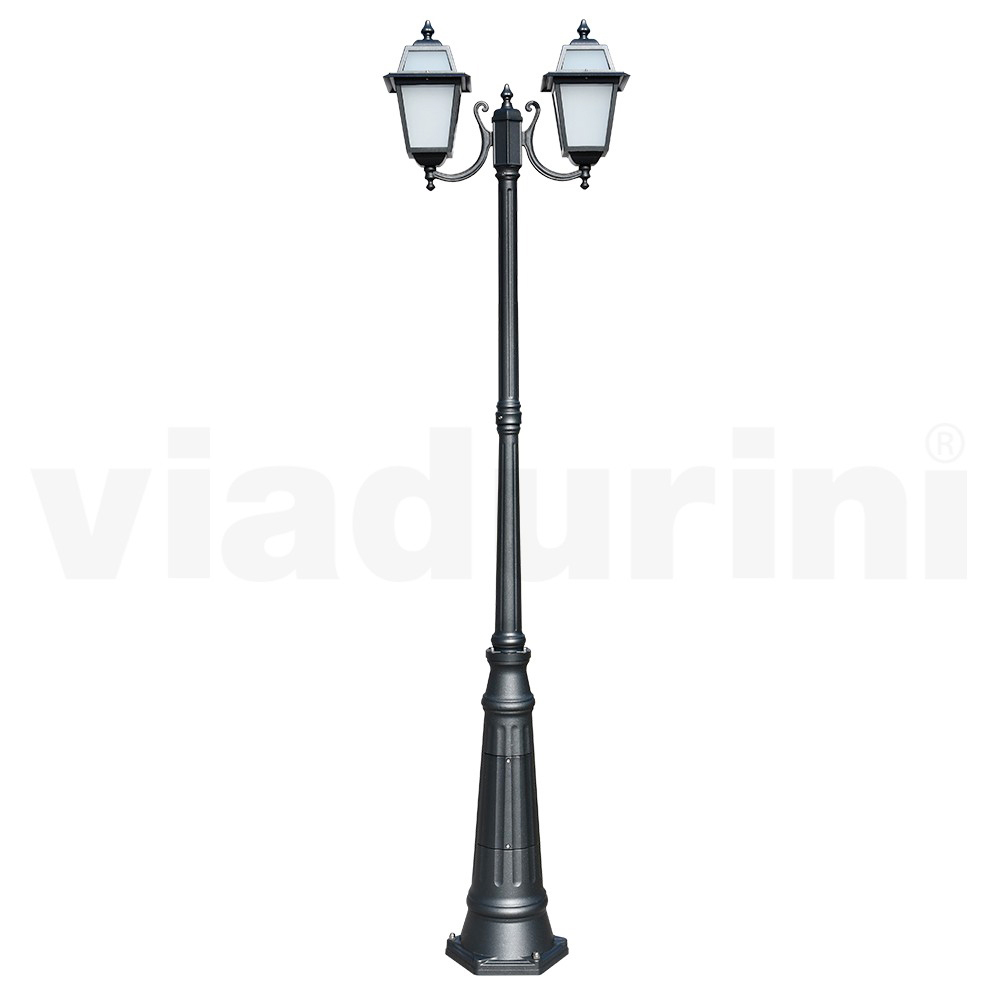 Deze straatlamp van gegoten aluminium met zijn antracietkleurige afwerking is een stijlvolle keuze voor elke buitenomgeving. Het klassieke en elegante ontwerp is voorzien van ambachtelijke details die de sfeer van vervlogen tijden oproepen. De 2 lantaarns, met aandacht voor de kleinste details, verspreiden een warm en zacht licht, ideaal om een lichtgevend pad in uw tuin te creëren of om op stijlvolle wijze een ontspanningsruimte buiten af te bakenen. Stevigheid en schoonheid komen samen in deze straatlamp, ontworpen om lang mee te gaan en bestand te zijn tegen weersinvloeden. Elegant en functioneel , het zal de lichtgevende signatuur van uw buitenruimte zijn.