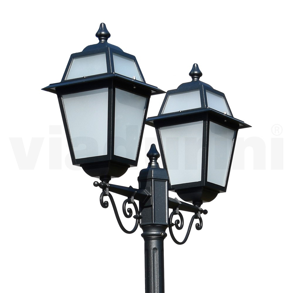Deze straatlamp van gegoten aluminium met zijn antracietkleurige afwerking is een stijlvolle keuze voor elke buitenomgeving. Het klassieke en elegante ontwerp is voorzien van ambachtelijke details die de sfeer van vervlogen tijden oproepen. De 2 lantaarns, met aandacht voor de kleinste details, verspreiden een warm en zacht licht, ideaal om een lichtgevend pad in uw tuin te creëren of om op stijlvolle wijze een ontspanningsruimte buiten af te bakenen. Stevigheid en schoonheid komen samen in deze straatlamp, ontworpen om lang mee te gaan en bestand te zijn tegen weersinvloeden. Elegant en functioneel , het zal de lichtgevende signatuur van uw buitenruimte zijn.
