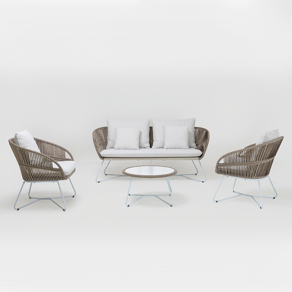 De touw structuur voegt een vleugje weerstand en duurzaamheid tegen de elementen toe, waardoor het zijn schoonheid in de loop der tijd behoudt. Het ontwerp wordt verder versterkt door aluminium details, die het een frisse en moderne uitstraling geven, waardoor het opvalt in tuinen, terrassen of bij het zwembad. De bijpassende salontafel, met een blad van glas, is de ideale aanvulling voor drankjes en hapjes, waardoor het de perfecte set is voor uw gasten en voor uw avonden in de buitenlucht.