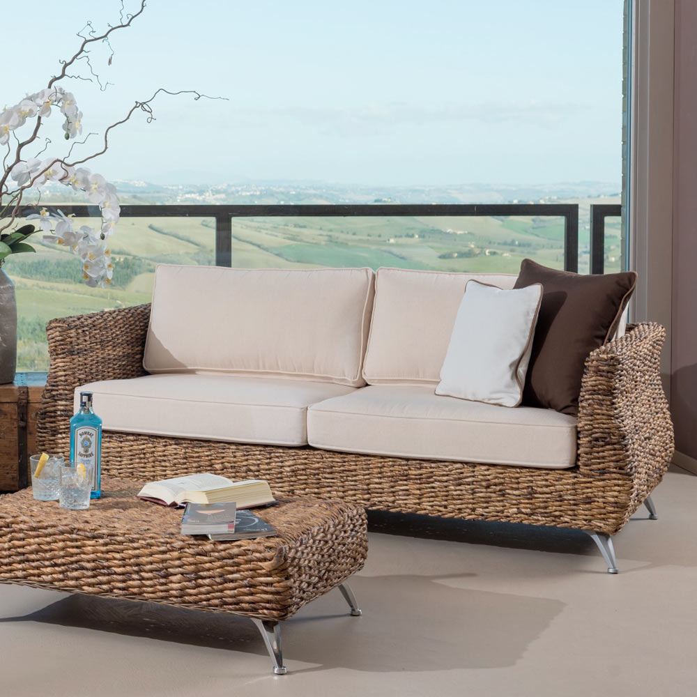 De living room behoort tot een hele collectie die opvalt door zijn moderne tinten zowel in het ontwerp van de stoelen als in het detail van de aluminium poten . Tegelijkertijd wordt het geanimeerd door de warmte van het natuurlijke weefsel , handgemaakt met behulp van een verfijnde natuurlijke banaan vlecht.