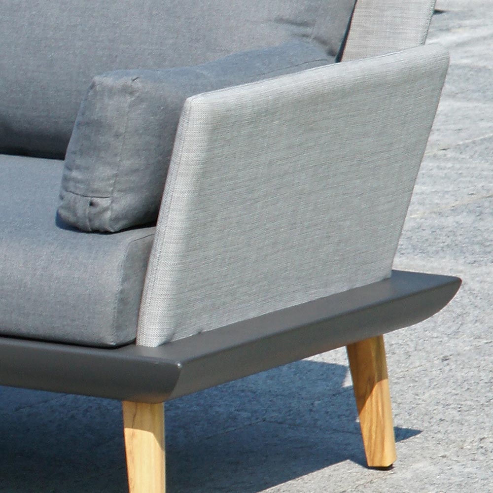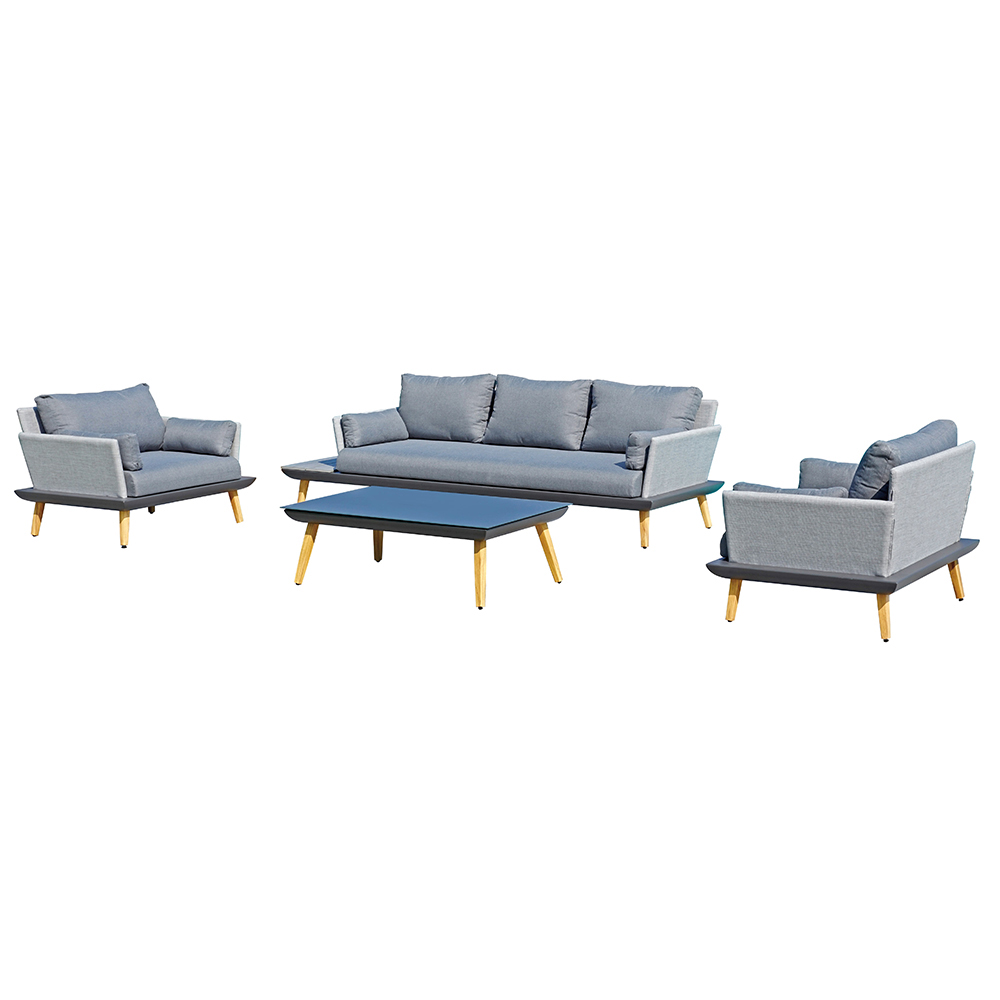Buitenlounge bestaande uit 2 fauteuils en een 3-zitsbank uitgerust met een praktische bijzettafel met harshouten blad bedekt met