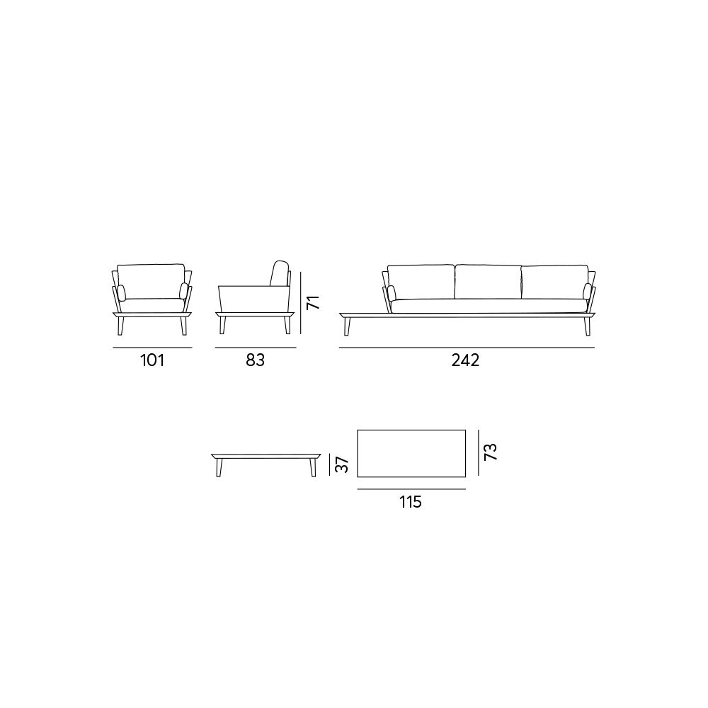 - driezitsbank: B 242 x D 83 x H 71 cm;