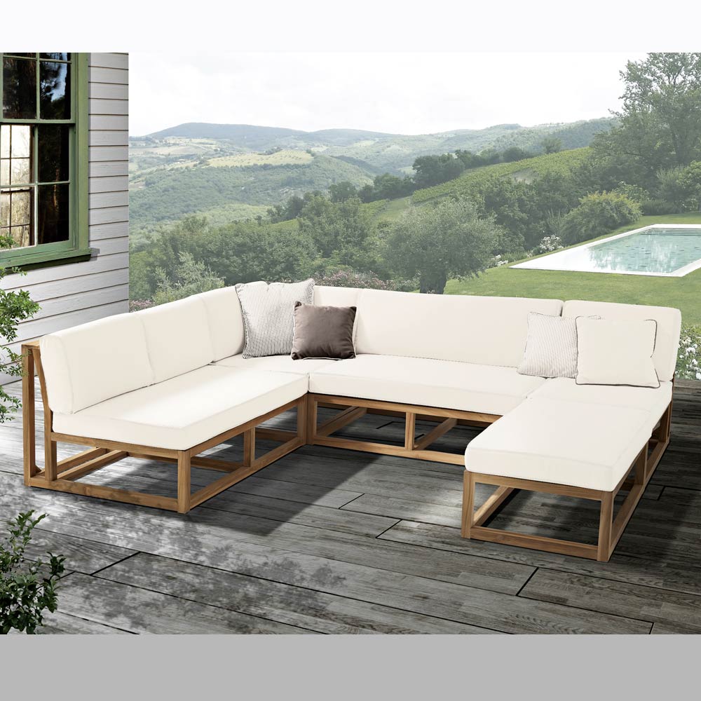 natuurlijke teak structuur. Stel jezelf voor zittend in deze modulaire tuin loungeset die deskundig vakmanschap combineert met eigentijds design. Elk element, van het natuurlijke teak frame tot de strakke, moderne lijnen , is ontworpen om je eigen persoonlijke oase te creëren. Teakhout, bekend om zijn sterkte en duurzaamheid, zorgt ervoor dat deze set een blijvend kenmerk van je buitenruimte wordt, sierlijk veroudert en na verloop van tijd nog aantrekkelijker wordt.