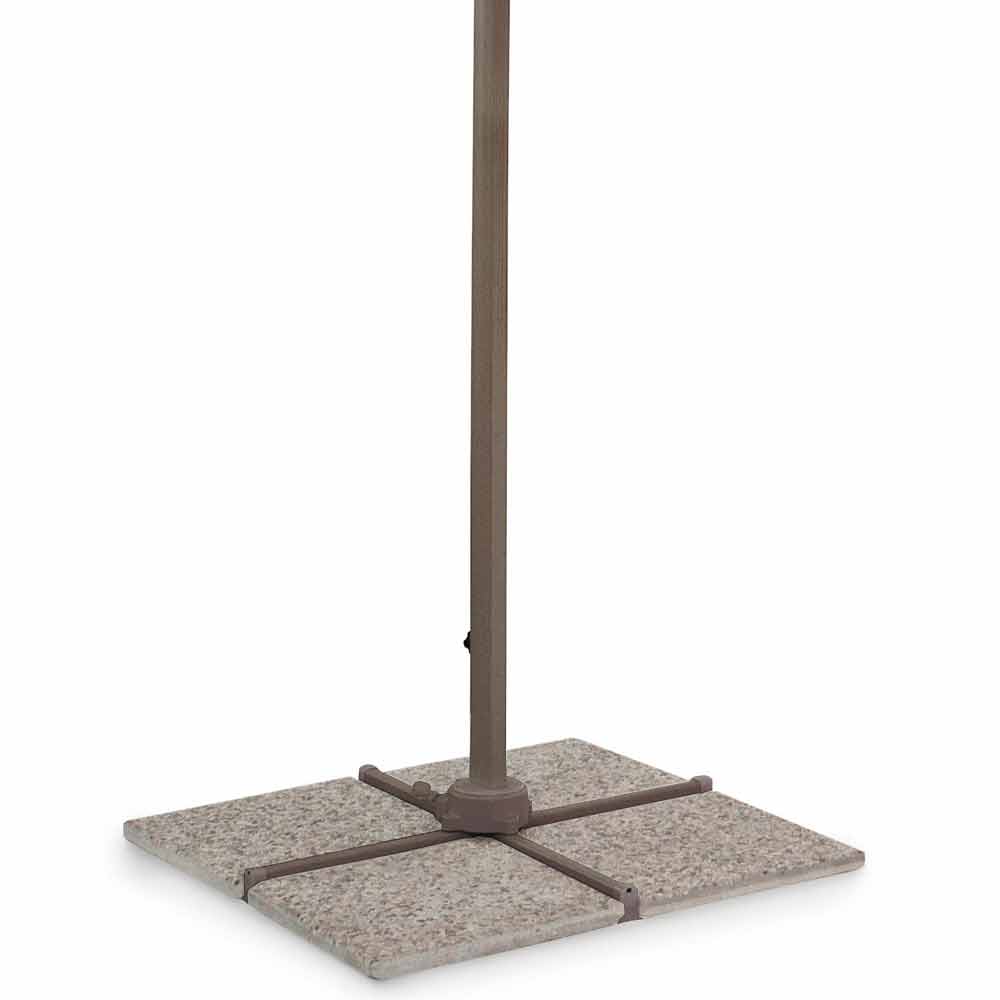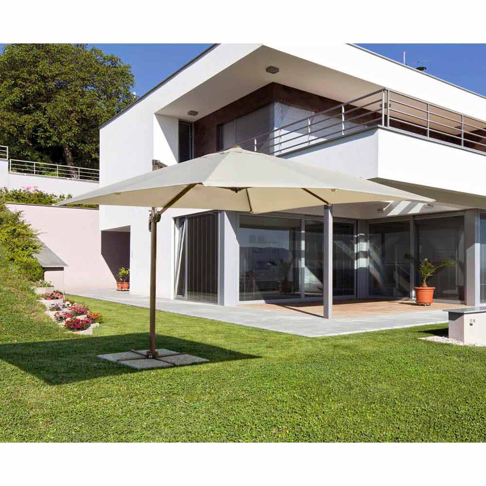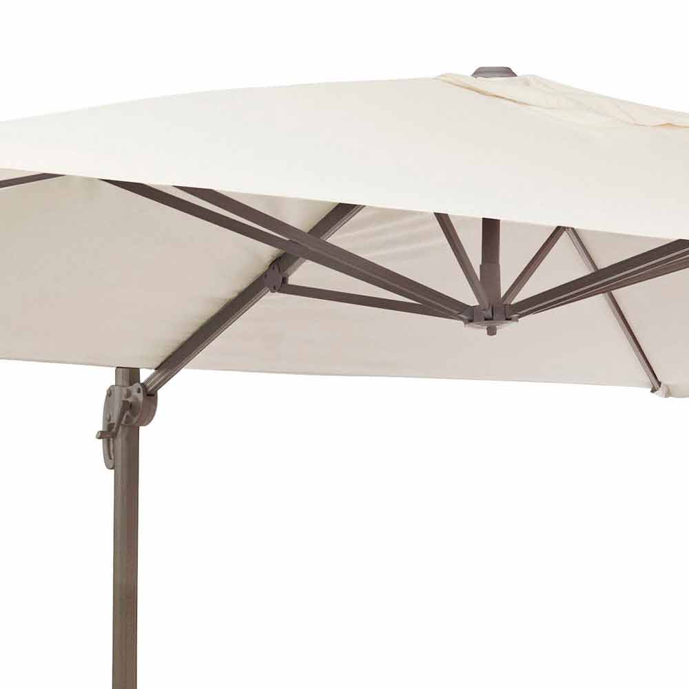 Gepoedercoate aluminium structuur (polyester). 53x77mm paal, 25x40mm hangende paal, 8 14x24mm ribben. Natuurlijke polyester stof 200gr / m2 met pa (polyamide) coating. Kruisvoet in staal . Handmatig draaibare 360 ° paal.