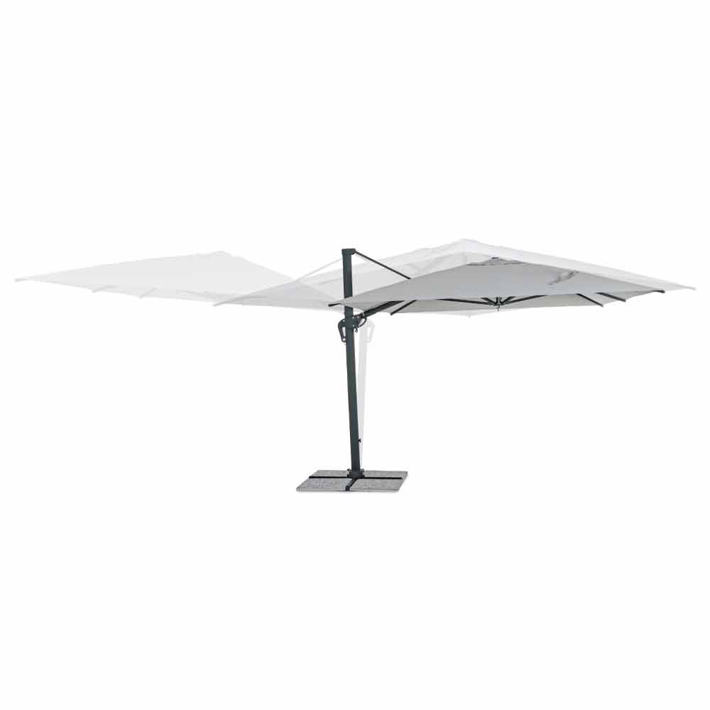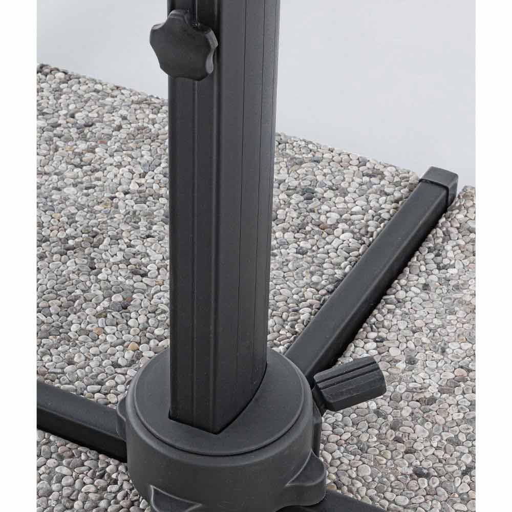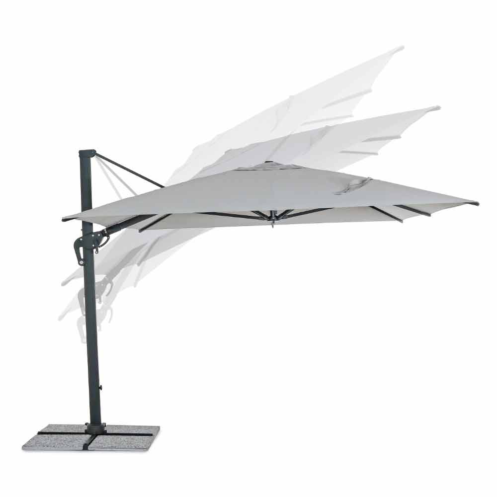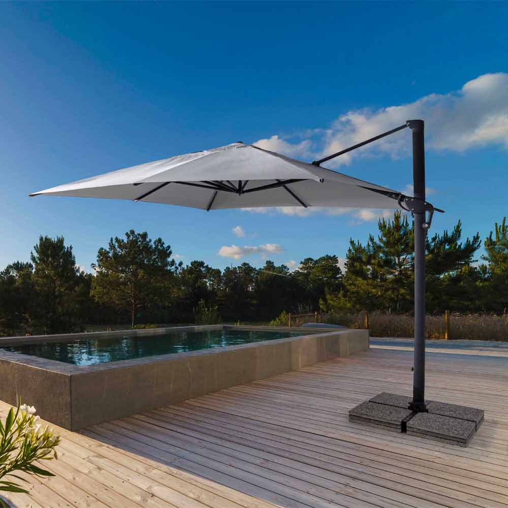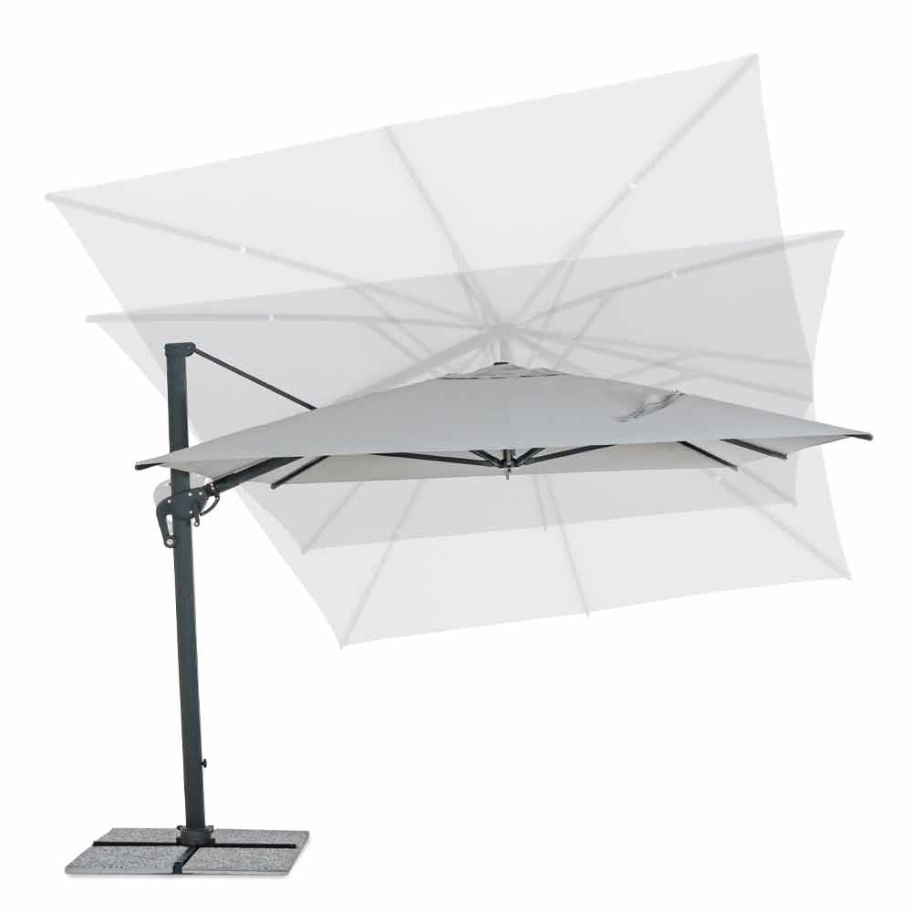 Gepoedercoate aluminium structuur (polyester). 93x57mm paal. 8 ribben 28x18mm. Lichtgrijze polyester stof 250gr / m2 met pa (polyamide) coating. Kruisvoet in staal . 360 ° roterende paal met pedaal. Verticale helling met handgreep met 5 standen. Voorzien van handgreep voor het rechts-links kantelen van de paraplu.