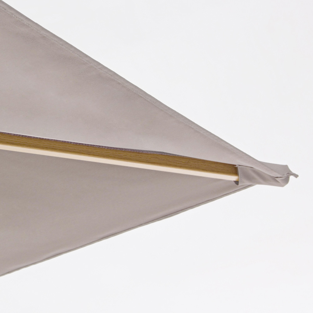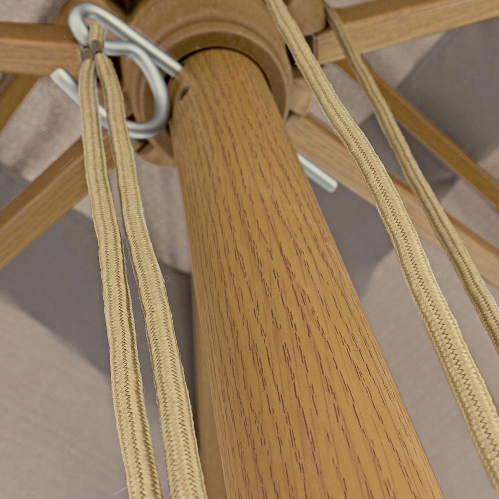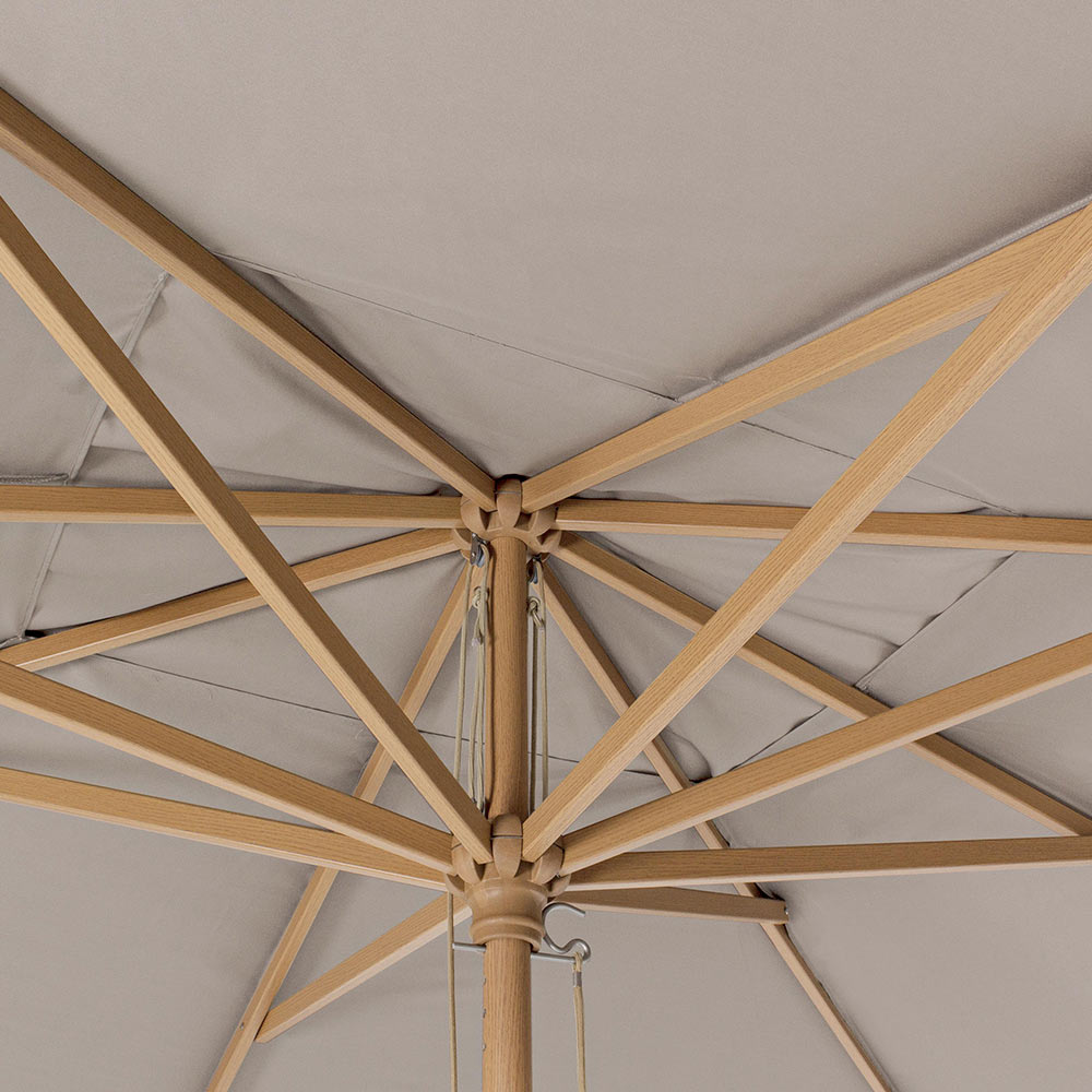 Aluminium structuur met houteffect afwerking. Kunststof kroon. Paal Ø48 x 1,8 mm. 8 ribben 20x30 mm. 235 gr / m2 polyester plaat.