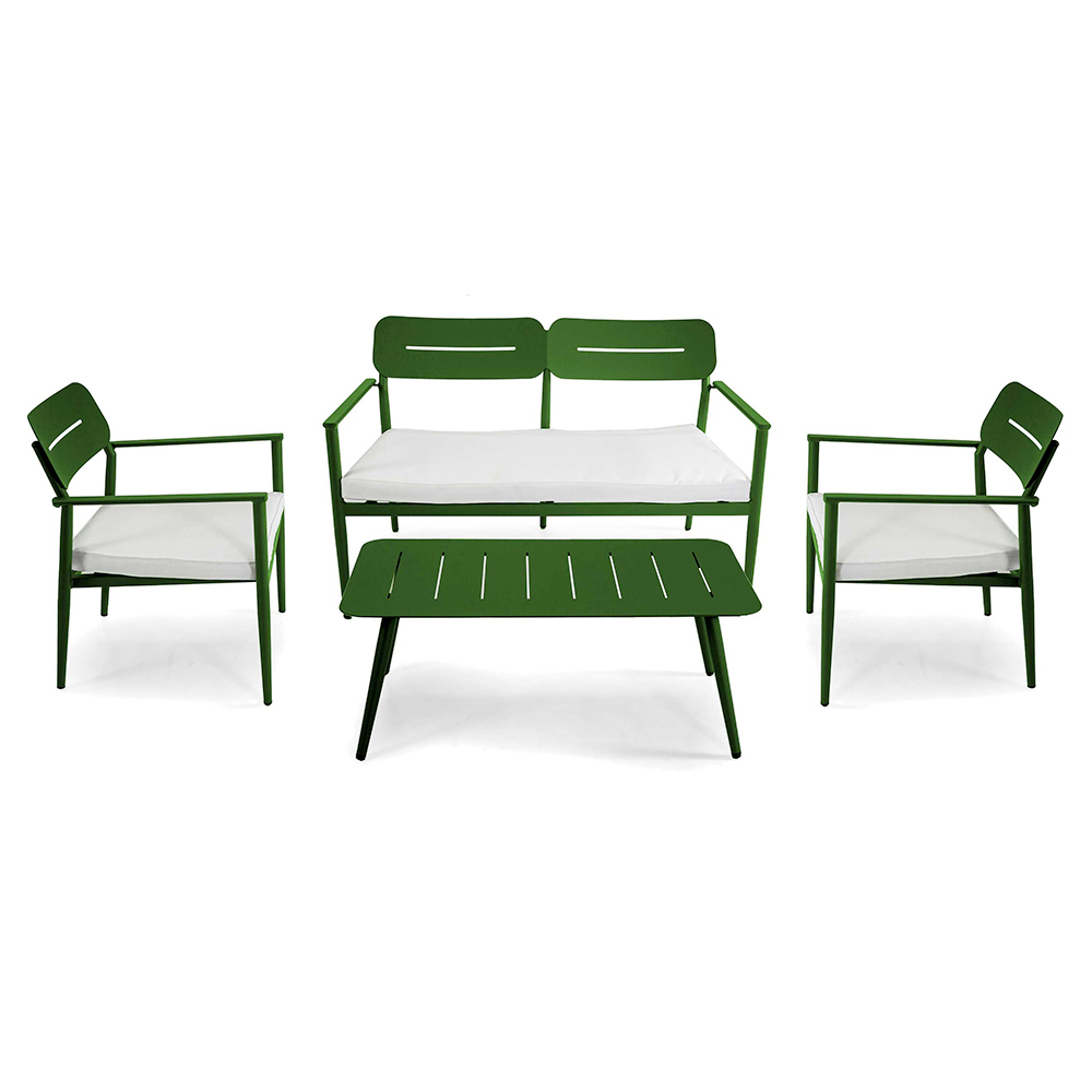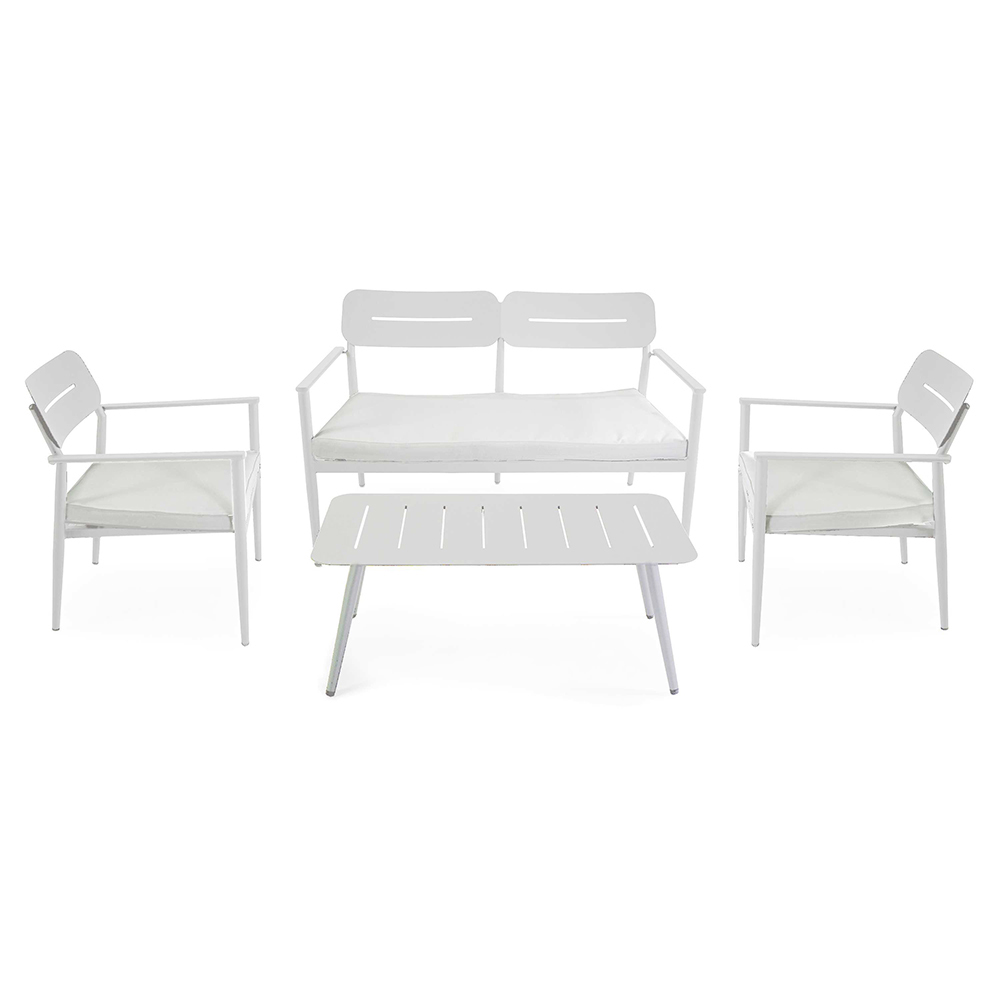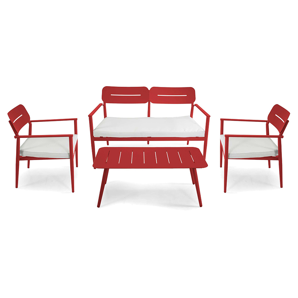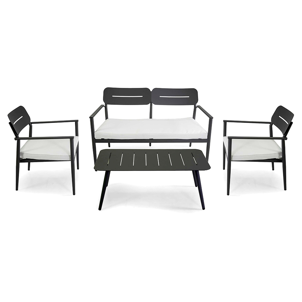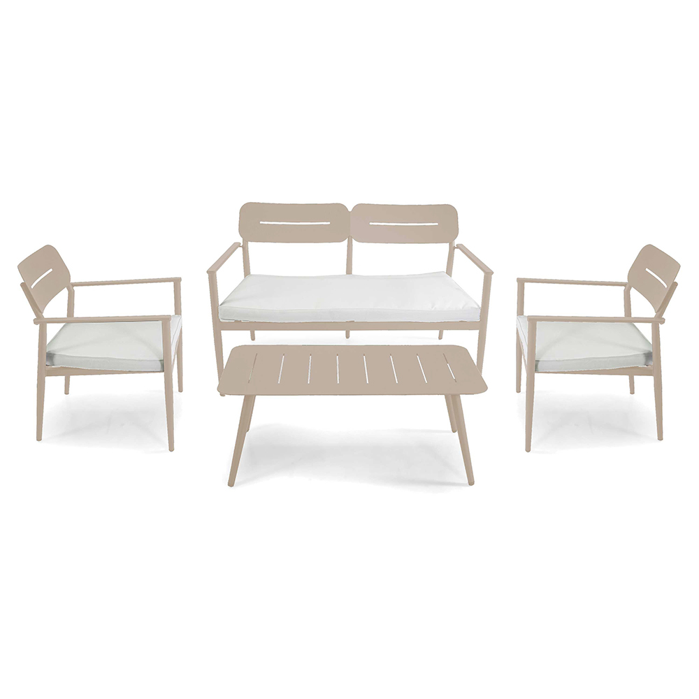 Deze outdoor lounge combineert functionaliteit en moderne stijl , perfect voor degenen die buitenruimtes met smaak willen inrichten. Het aluminium frame is zowel elegant als stevig en garandeert een lange levensduur en eenvoudig onderhoud. Elk element van de set is ontworpen om maximaal comfort te bieden, van de fauteuil met zijn ergonomische rugleuning, tot de ruime sofa met zachte en uitnodigende kussens.