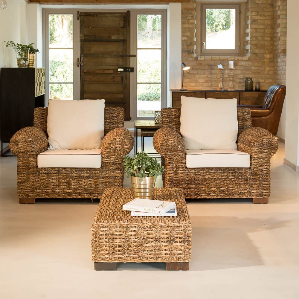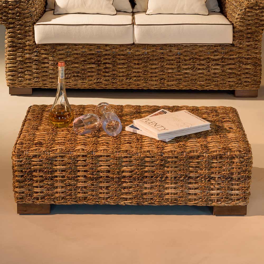De koffietafel behoort tot een hele collectie die uniek is door de afgeronde cilindrische armleuningen en een verfijnd dicht weefsel van natuurlijke abaca vezel, afkomstig van de bananenboom . De zittingen zijn groot en voorzien van comfortabele kussens .