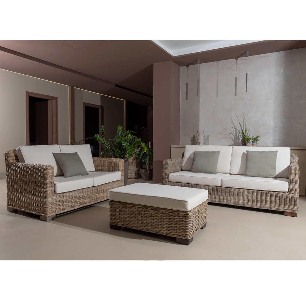 Koffietafel die kan worden omgevormd tot een buitenpoef gemaakt in handgeweven grijze kubu met standaard kussen inclusief in de standaard " Ecru " afwerking. Kubu is een natuurlijk materiaal dat behoort tot de meest resistente materialen die in de natuur voorkomen, maar dat altijd zeer licht blijft.