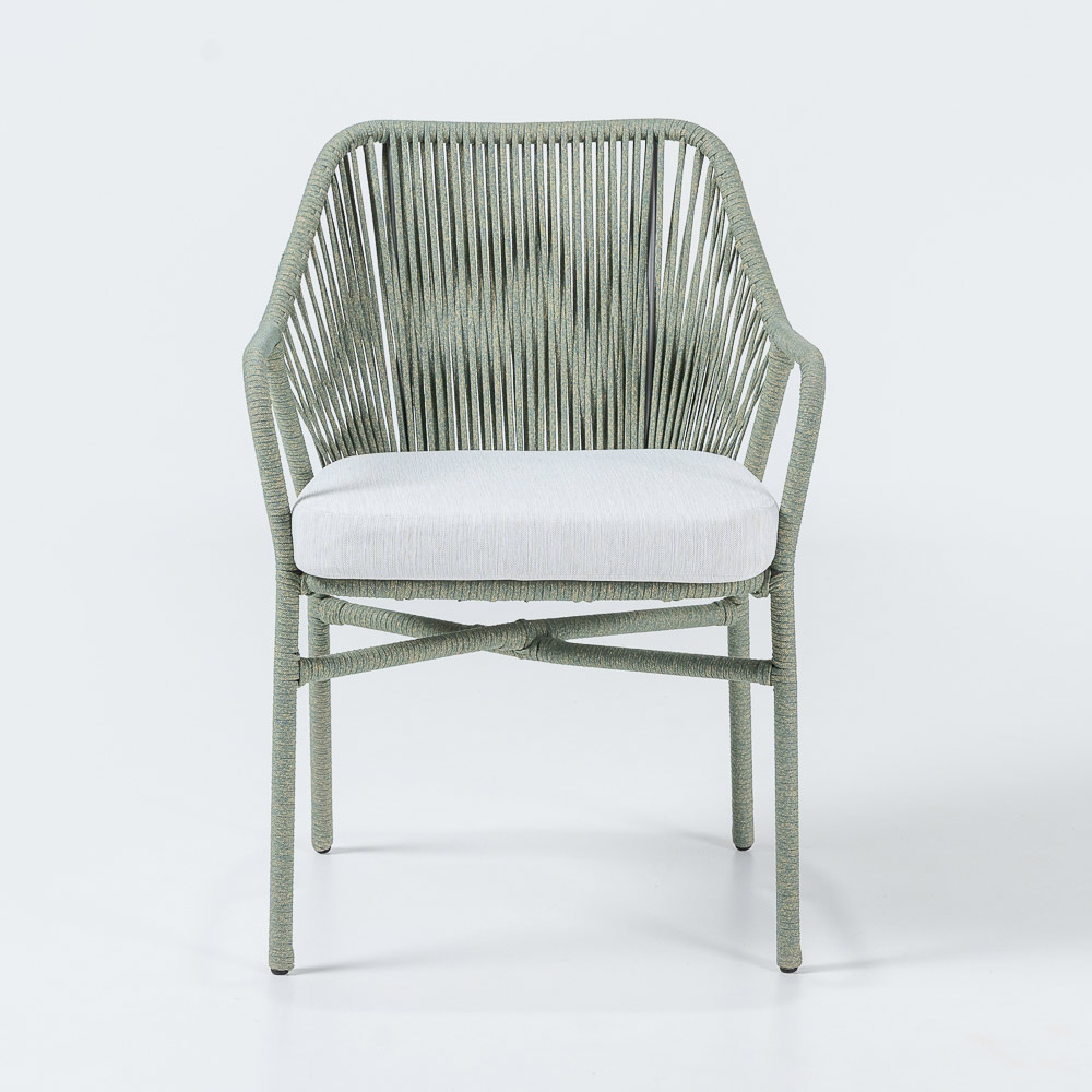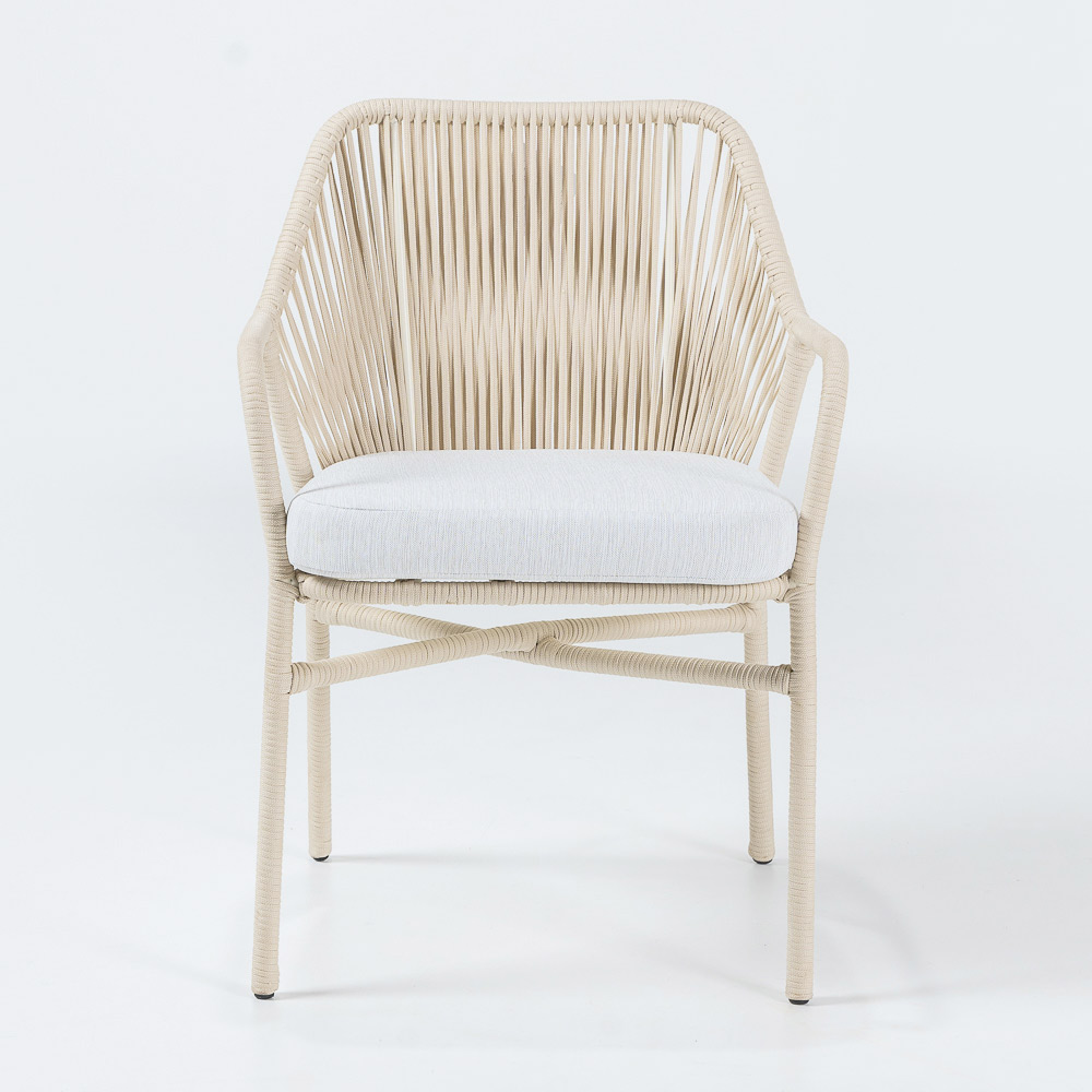 Deze tuinfauteuil is een oase van ontspanning, ideaal om te genieten van de rust van buitenruimtes. Het ontwerp is eigentijds, met een lichte structuur van gevlochten touw die een spel van transparantie en schaduwen creëert en diepte en visuele interesse toevoegt aan uw tuin of terras.