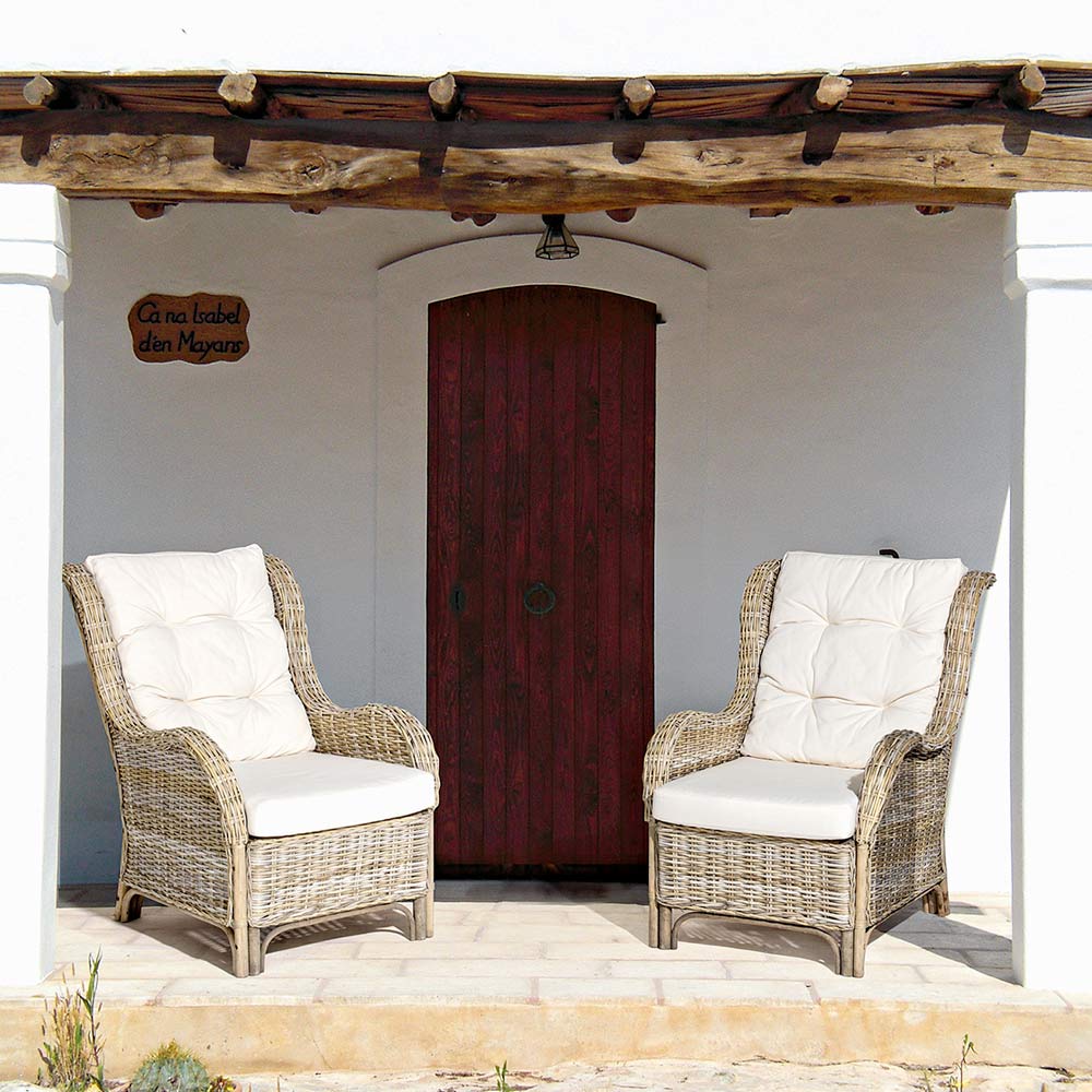 Fauteuil tuinontwerp gemaakt van natuurlijke rotan voor buitengebruik, uitgerust met kussens.