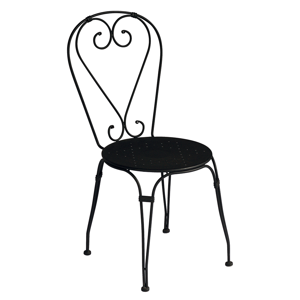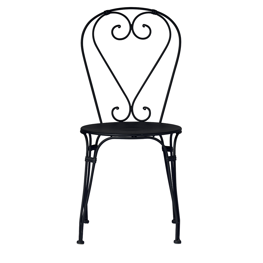 Stapelbare buitenstoel met zitting en structuur gemaakt van zwart geverfd ijzer met antiroestbehandeling . De tuinstoel wordt gekenmerkt door het hartvormige ontwerp meteenvoudige lijnen en sobere vormen die hem bijzonder veelzijdig maken dankzij het kleine formaat, de lichtheid en de beheersbaarheid van de structuur.