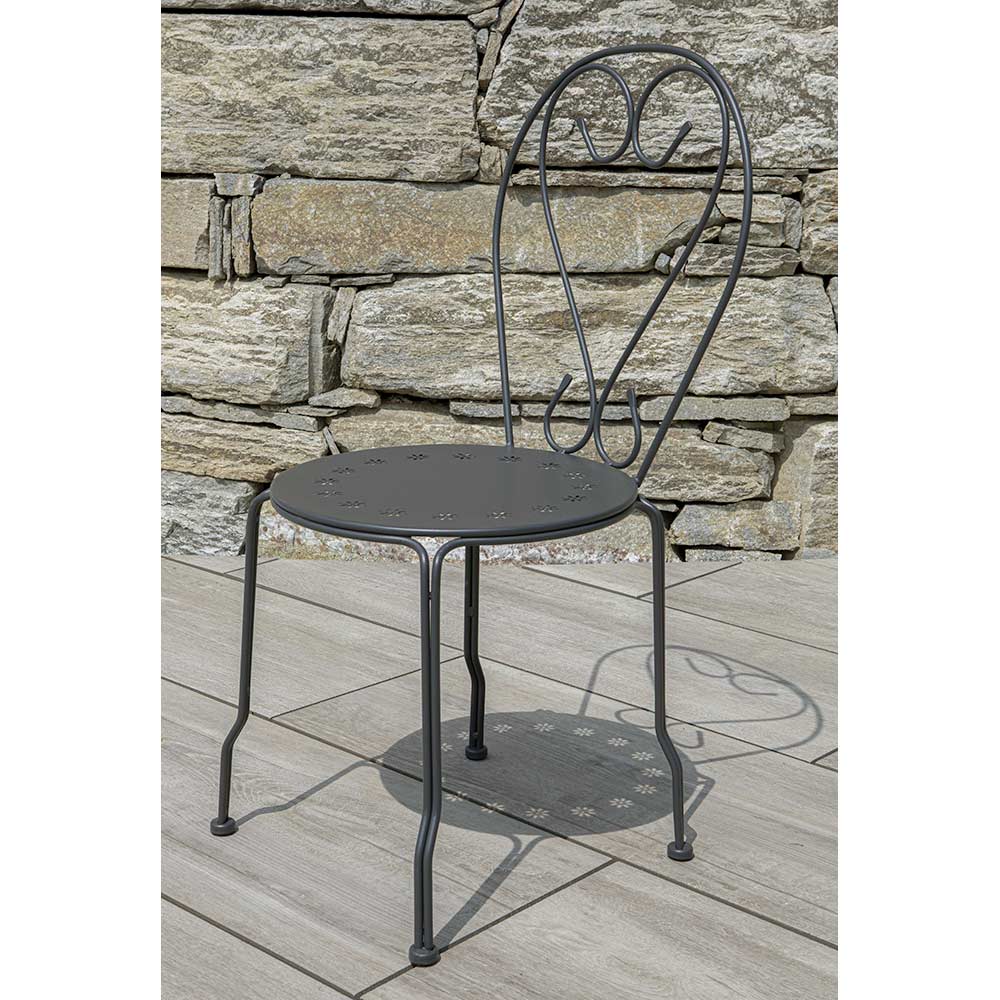 Deze gelakte metalen stoel is een echt designjuweeltje, perfect om een vleugje elegantie en charme toe te voegen aan elke buitenruimte. Met zijn zachte lijnen en romantische wendingen in de rugleuning is deze stoel niet zomaar een meubelstuk, maar een waar symbool van stijl en comfort.