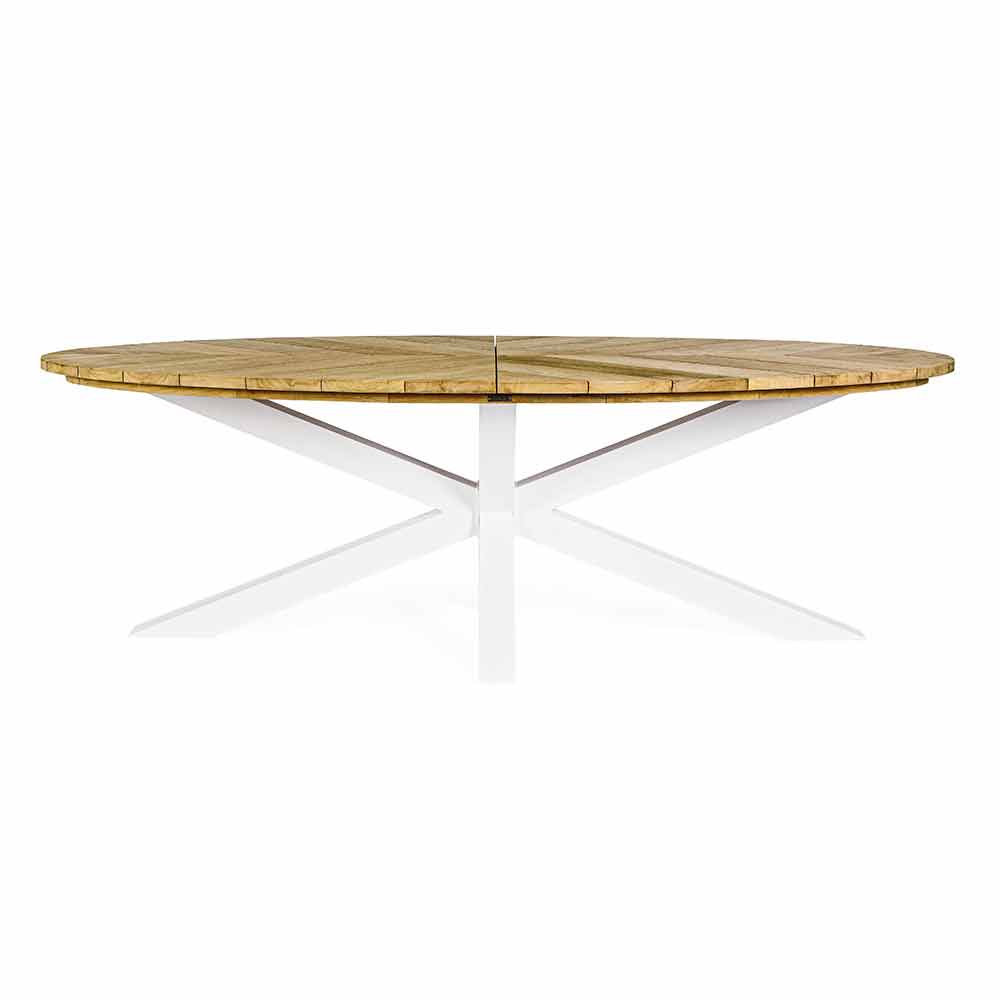 Blad in teakhout (klasse A) - SVLK (gecertificeerd hout uit duurzame bossen), poten in gepoedercoat aluminium (polyester). Ferramente in gegalvaniseerd staal.