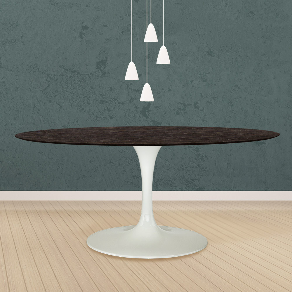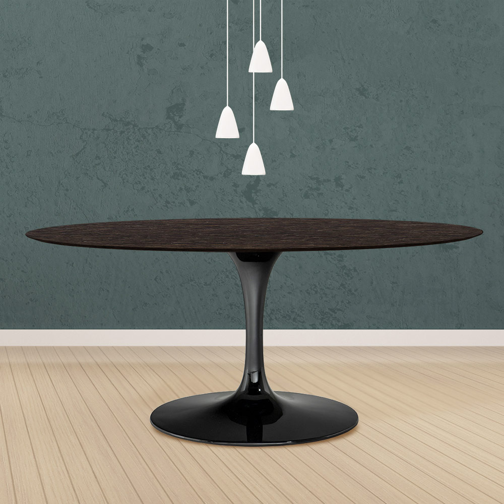 Eettafel ovaal in mokka gebeitst eiken en gepolijst aluminium onderstel Made in Italy