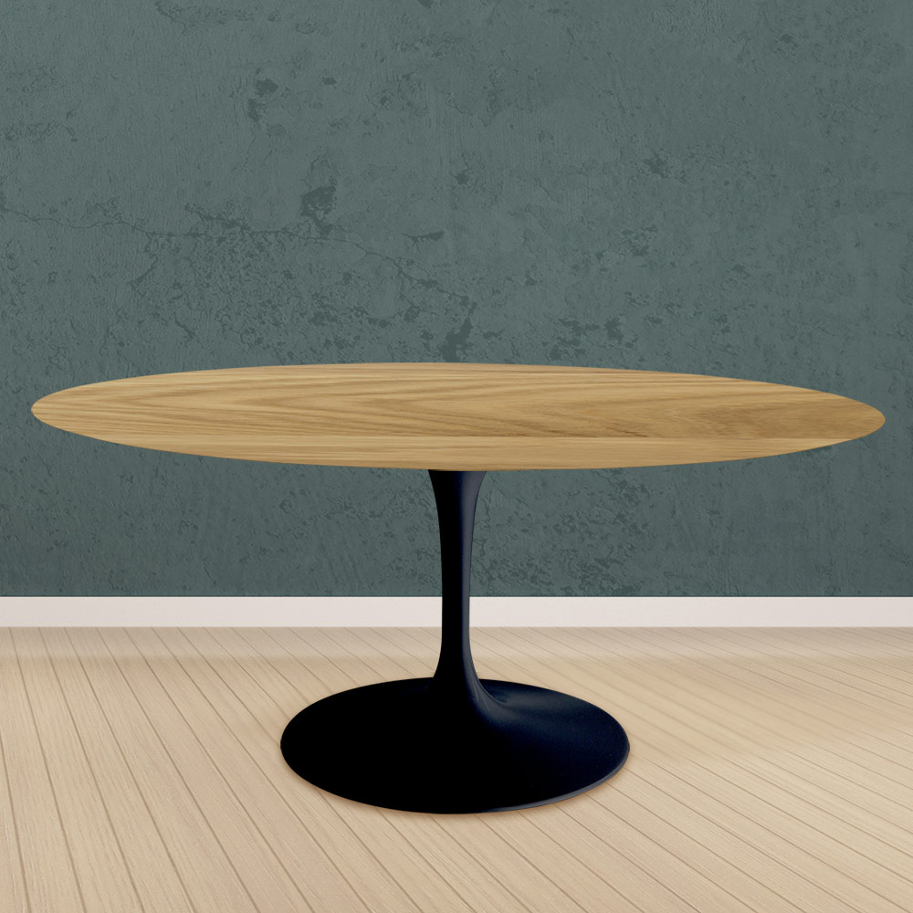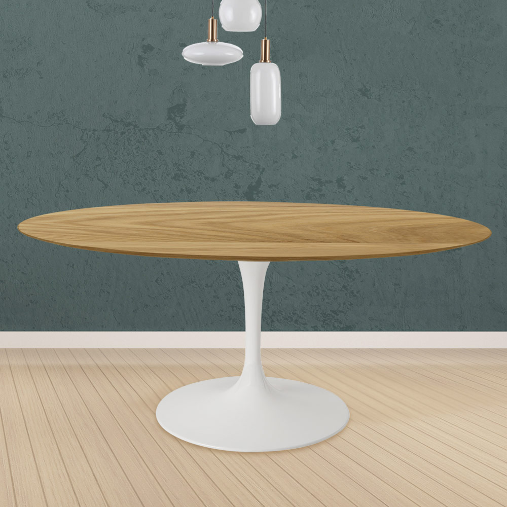 lineaire en elegante afwerkingen. De vereniging tussen de natuurlijke eik van het blad en het gepolijste aluminium van het onderstel garandeert