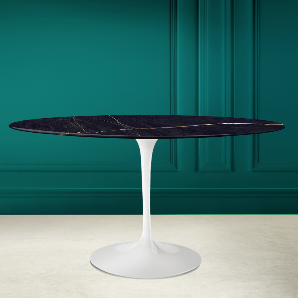 gepolijst aluminium onderstel. Deze tafel is het perfecte element om een originele touch te geven aan elke woonkamer en keuken dankzij de ovale vorm en noir laurent keramiek. De