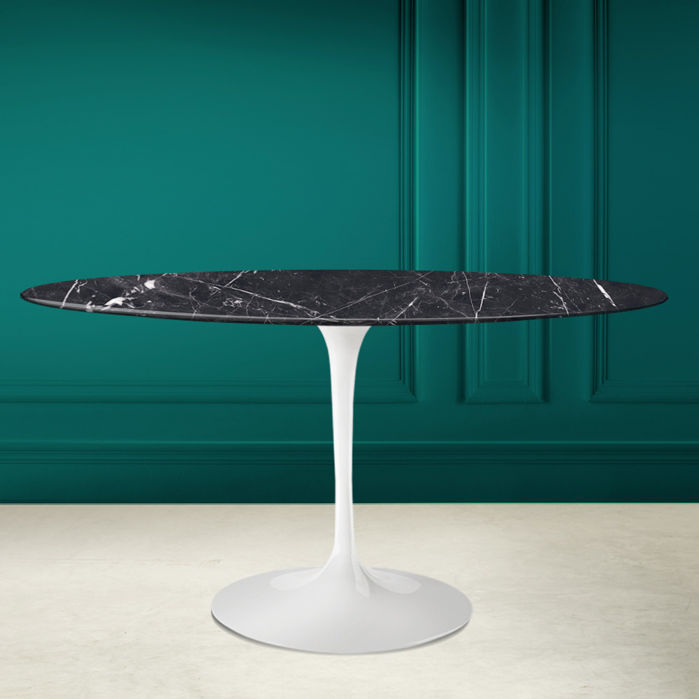 voet van gepolijst aluminium. Deze tafel is het perfecte element om een originele touch te geven aan elke woonkamer en keuken dankzij de ovale vorm en het marquinia keramiek. De